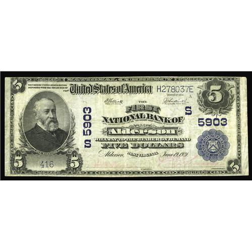 <B>Alderson, WV</B></I> - $5 1902 Plain Back Fr. 607 <B>The First NB </B></I> Ch. # 5903<BR>This new addition to the census makes an even dozen large size notes from this small community which hosts a well known Federal Bureau of Prisons institution for female offenders. <B>Very Fine.</B></I>