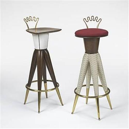 Aldo Bartolucci stools, pair Bartolucci Arts, Inc. Italy, c. 1954 walnut, brass, upholstery 12 w x 12.5 d x 35 h inches Bartolucci designed several different stools, each having its own distinctive figurative style. Signed with branded manufacturer's marks to underside: [Bartolucci Arts Inc].