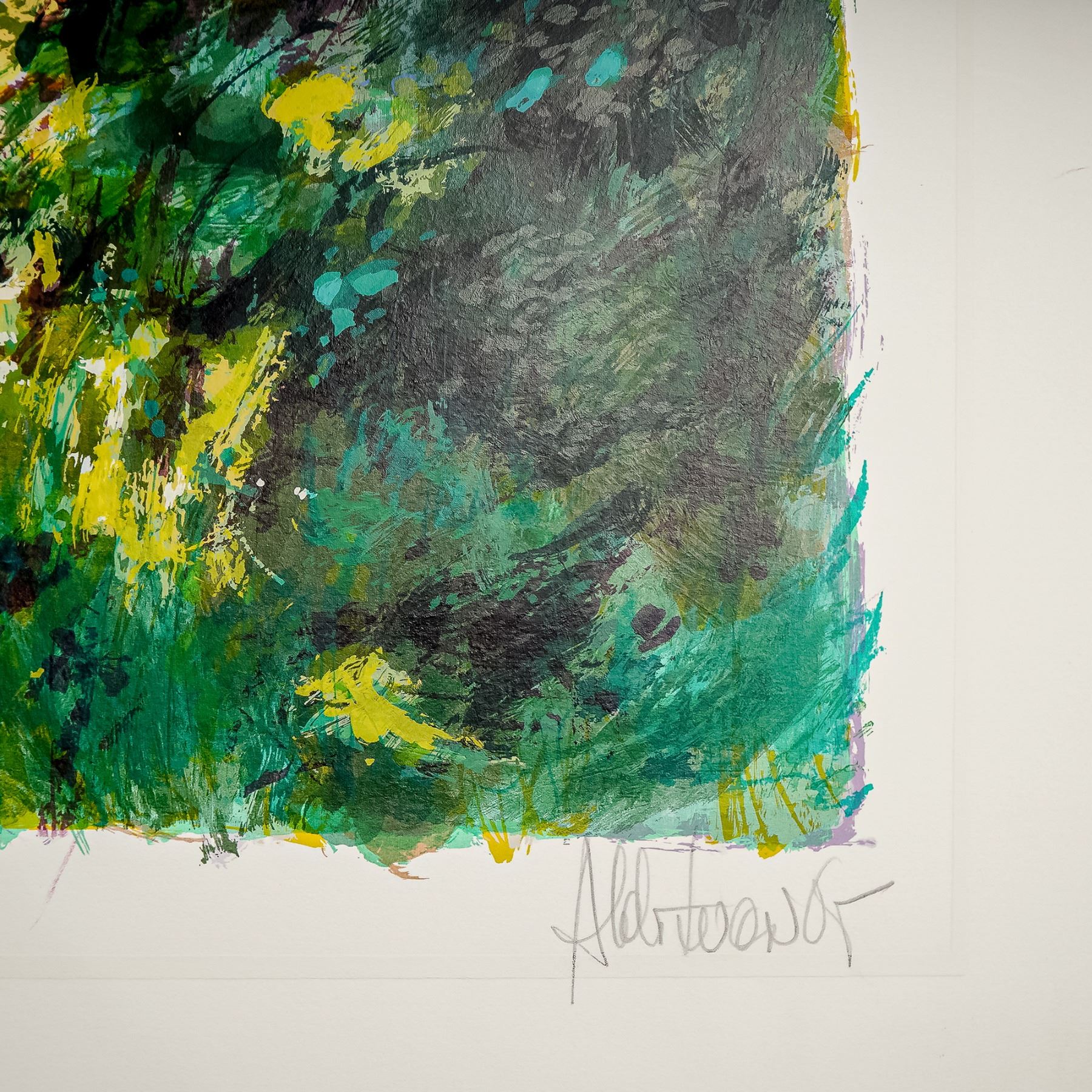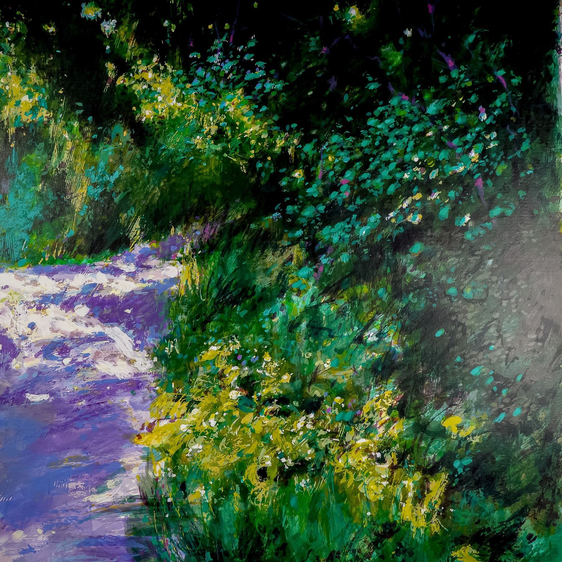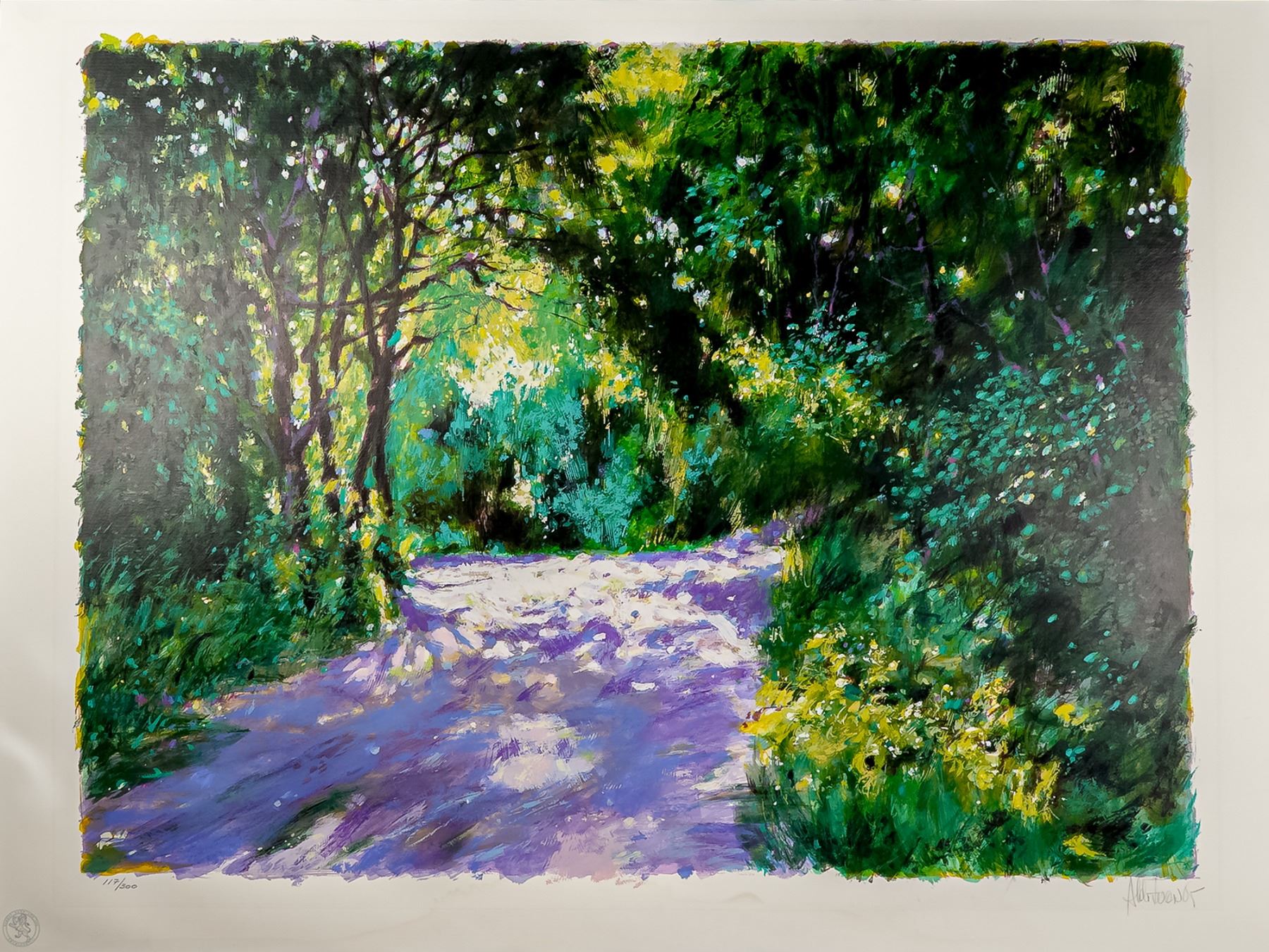 A vibrant and atmospheric serigraph on paper by Aldo Luongo, titled Road to Cordoba. This work captures the dappled light of a secluded country path, with lush foliage illuminated by bold strokes of green, yellow, and violet hues. Luongo, celebrated internationally as the Romantic Impressionist, is known for his expressive use of color and light to evoke passion and memory in his landscapes and figurative works. Signed in pencil by the artist lower right and numbered 117/300 lower left, with embossed seals of Robert Bane Ltd. and Accent Studios.