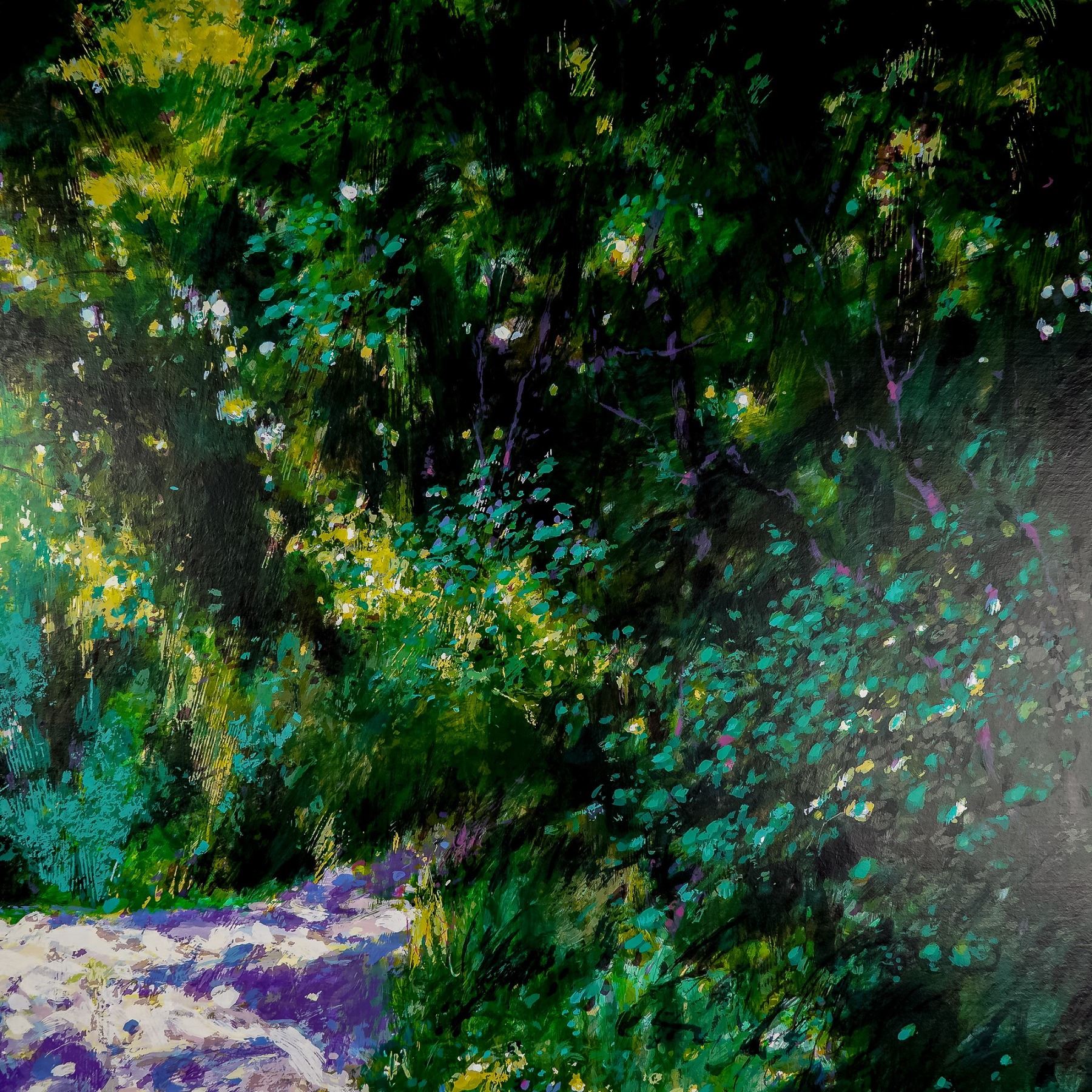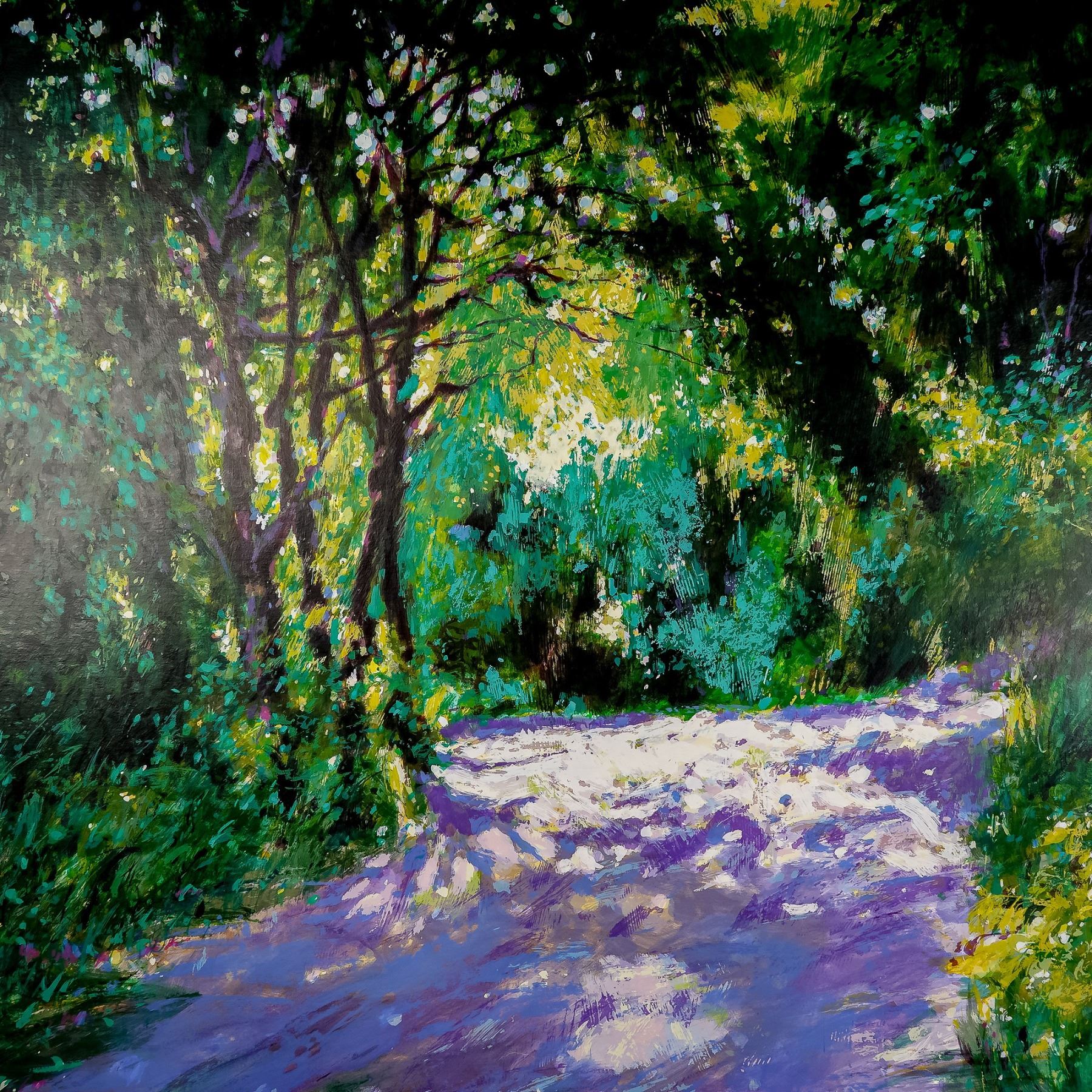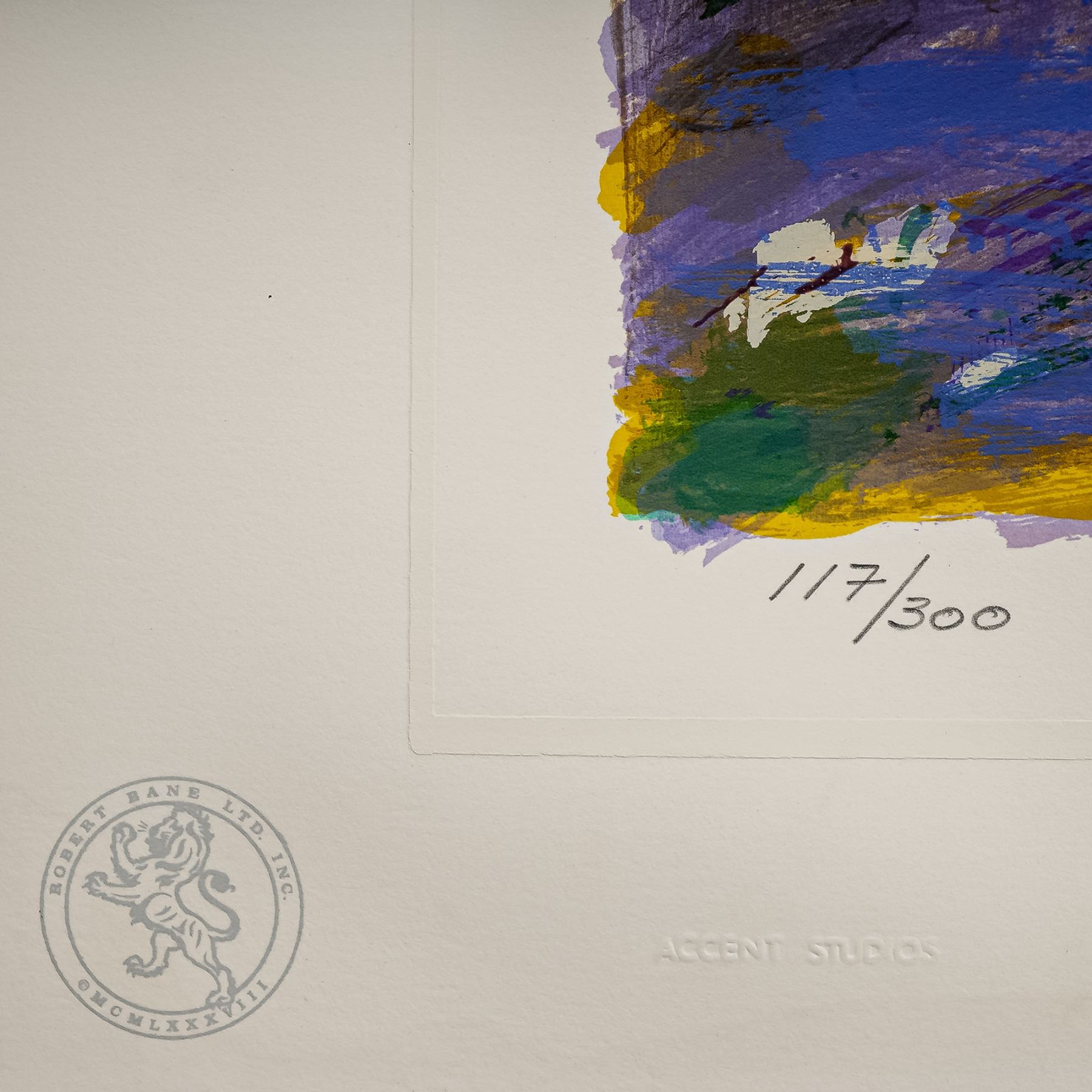 A vibrant and atmospheric serigraph on paper by Aldo Luongo, titled Road to Cordoba. This work captures the dappled light of a secluded country path, with lush foliage illuminated by bold strokes of green, yellow, and violet hues. Luongo, celebrated internationally as the Romantic Impressionist, is known for his expressive use of color and light to evoke passion and memory in his landscapes and figurative works. Signed in pencil by the artist lower right and numbered 117/300 lower left, with embossed seals of Robert Bane Ltd. and Accent Studios.