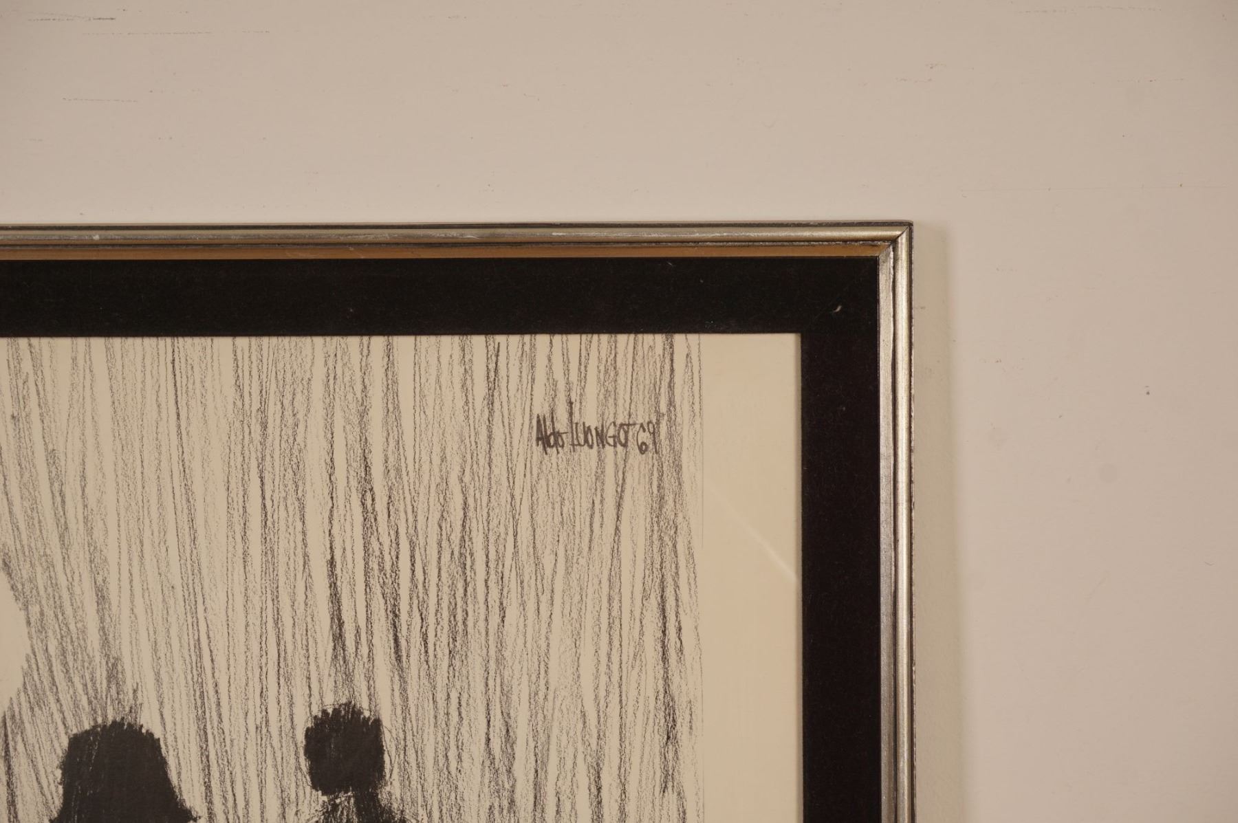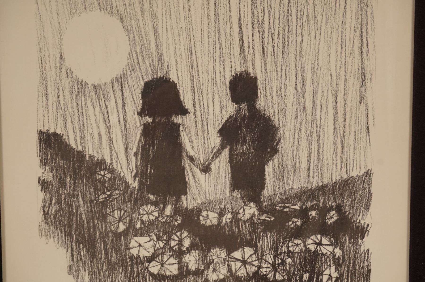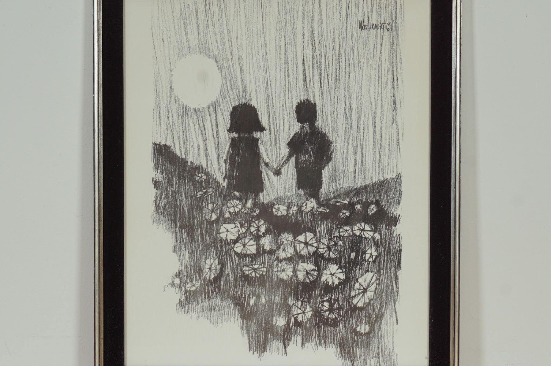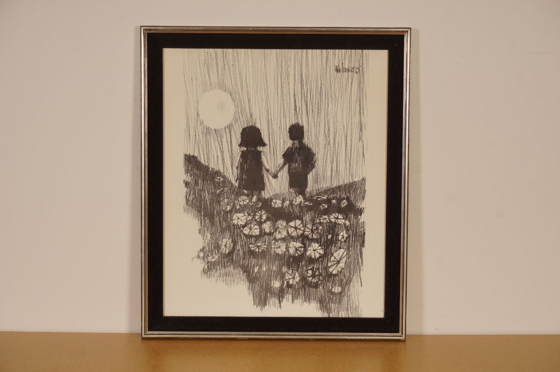 A captivating lithograph on paper by Aldo Luongo titled Holding Hands, featuring two silhouetted children standing amid a field of flowers beneath a glowing moon. Rendered in expressive monochrome strokes, this work beautifully captures Luongo's signature sense of intimacy and nostalgia. The delicate interplay of light and shadow evokes both innocence and timeless romance, hallmarks of Luongo's early career pieces. Signed and dated in the plate, this framed artwork embodies the emotional depth and poetic charm that have made Luongo a beloved name in contemporary figurative art.