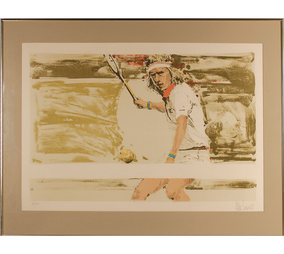 Color limited edition 30 x 21 lithograph of Bjorn Borg, numbered #81/200, signed in pencil in the lower border by the artist, Aldo Luongo. Matted and framed to an overall size of 35.25 x 27.25. In fine condition. Oversized.