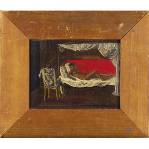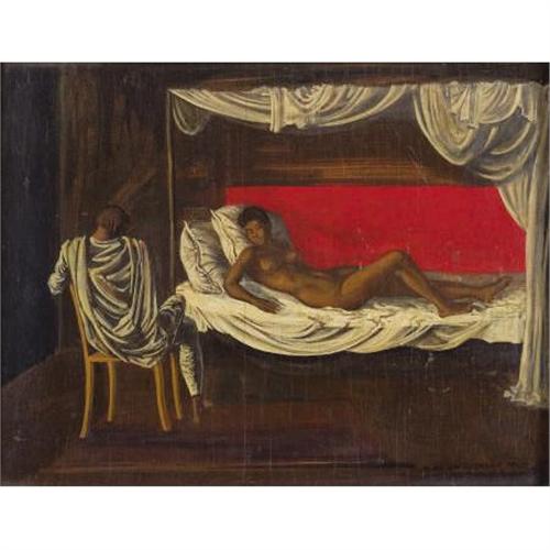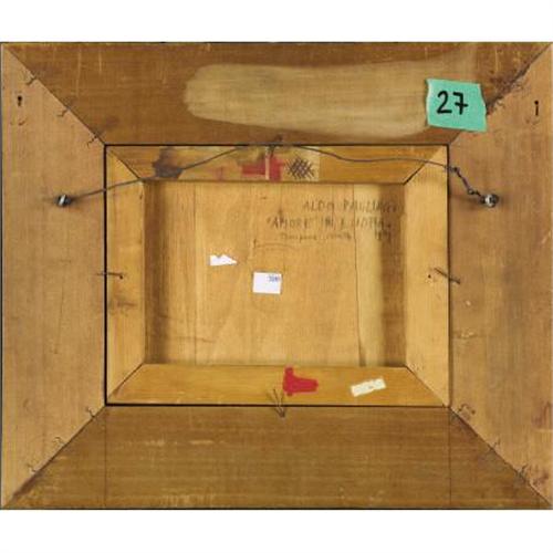 <B>ALDO PAGLIACCI (Italian, b. 1913)</B></I><BR><I>Amore in Ethiopia</B></I>, 1969<BR>Tempera on panel<BR>7-3/4 x 10-1/8 inches (19.7 x 25.7 cm)<BR>Signed and dated lower right: <I>Aldo Pagliacci 1969</B></I><BR> <B>Condition Report:</B> Surface grime, slight vertical cracking, nails along top and bottom edges, otherwise good condition.<BR><BR><b>Shipping:</b> Framed - without Glass, Small (<a target="_blank" href="http://www.heritageauctions.com/common/shipping.php">view shipping information</a>)