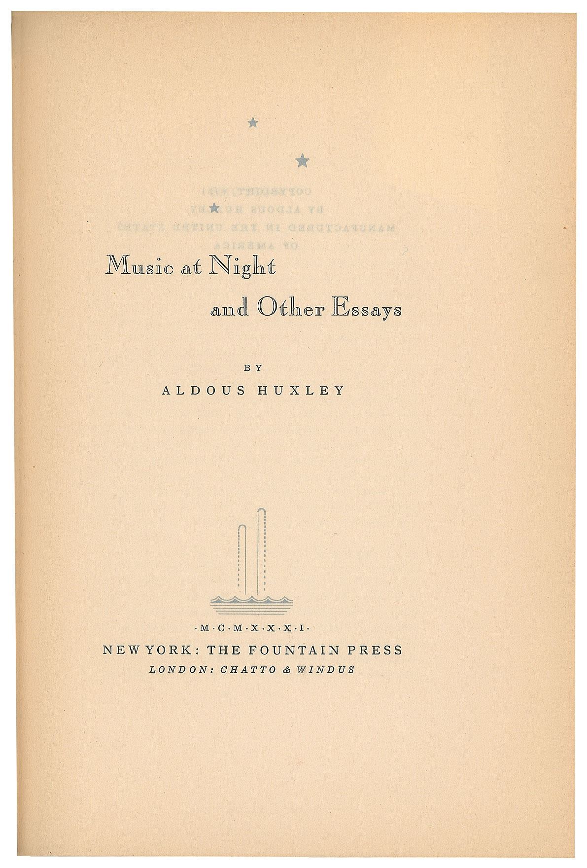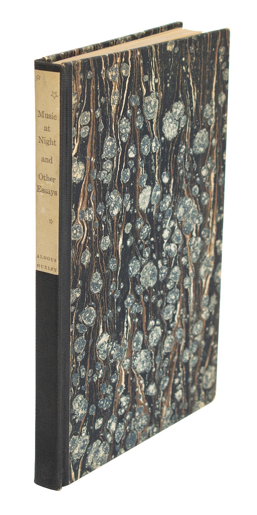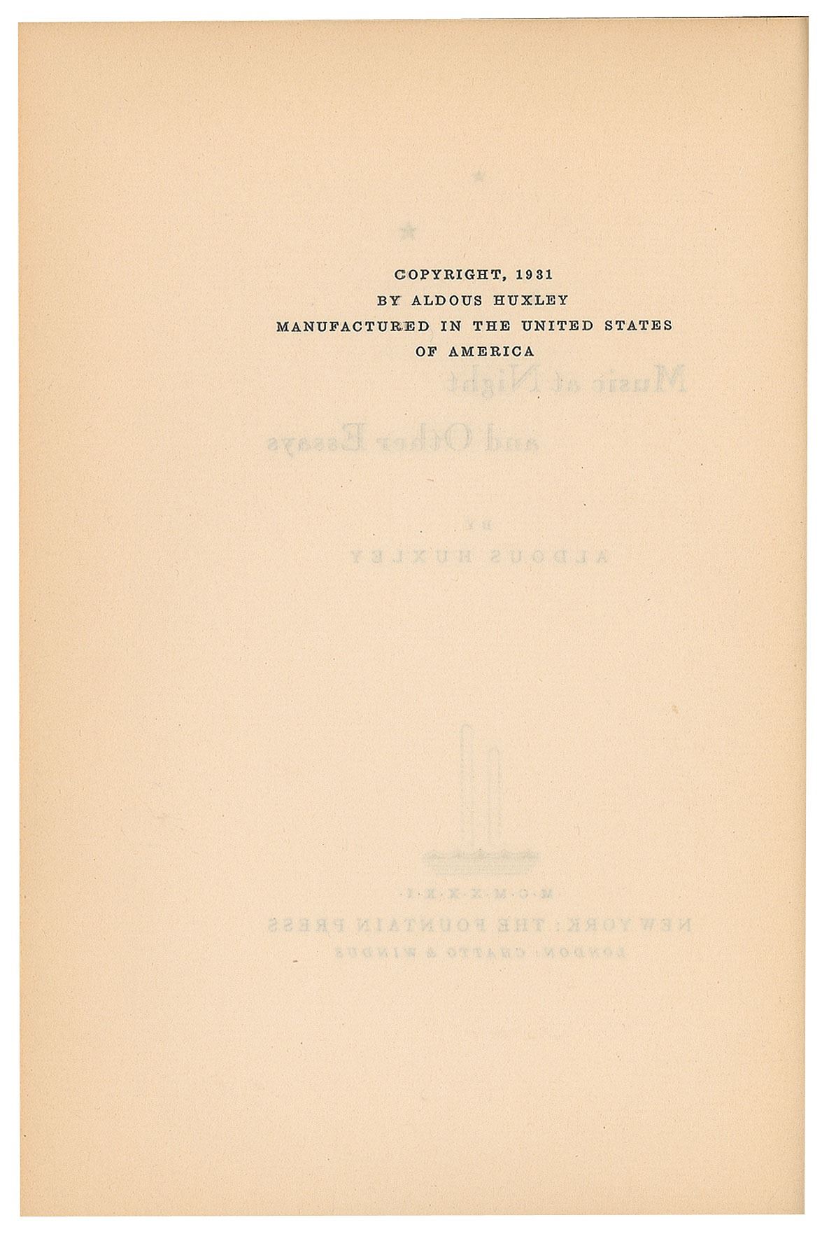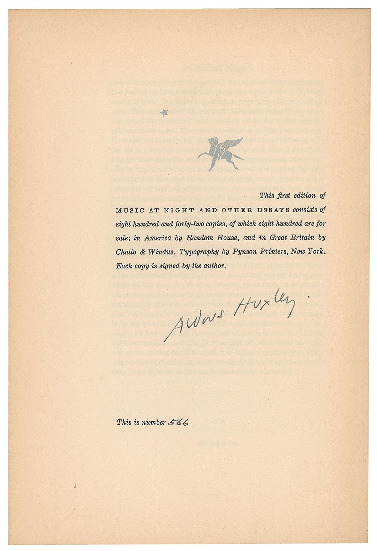 Signed book: Music at Night and Other Essays. First edition, limited issue, numbered 566/842. NY: The Fountain Press, 1931. Hardcover, 6 x 8.75, 146 pages. Signed on the colophon in fountain pen, "Aldous Huxley." Autographic condition: fine. Book condition: VG/None, with light wear to corners.