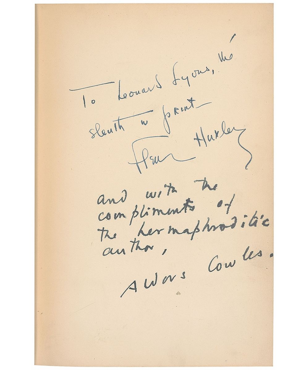 Signed book: Brave New World. Later printing. NY: Harper & Brothers, 1946. Hardcover, 5.5 x 8.25, 311 pages. Signed on the first free end page in black ink by Huxley, “And with the compliments of the hermaphroditic author, Aldous Cowles,” below a signature and inscription from Fleur Cowles, “To Leonard Lyons, the sleuth in print, Fleur Huxley.” Autographic condition: fine, with light toning to signed page. Book condition: VG/None. Red cloth-covered boards; light wear to edges, with tiny tears in cloth at corners/spine-ends and a bump to front upper edge; spine sunned; minor soiling; slightly yellowed. Cowles was a writer and editor, and Lyons a nationally syndicated columnist. An interesting associative piece, signed in an unusual manner.