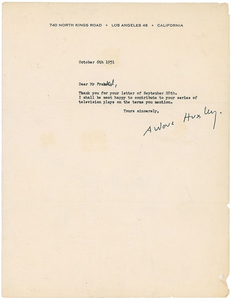 TLS, one onionskin page, 8.5 x 11, personal letterhead, October 6, 1951. Letter to ‘Mr. Frankel.’ In part: “I shall be most happy to contribute to your series of television plays on the terms you mention.” Scattered creases, a central vertical fold, a few dings and small tears to the right border and top edge, and an ink correction in Huxley’s hand,otherwise fine condition.