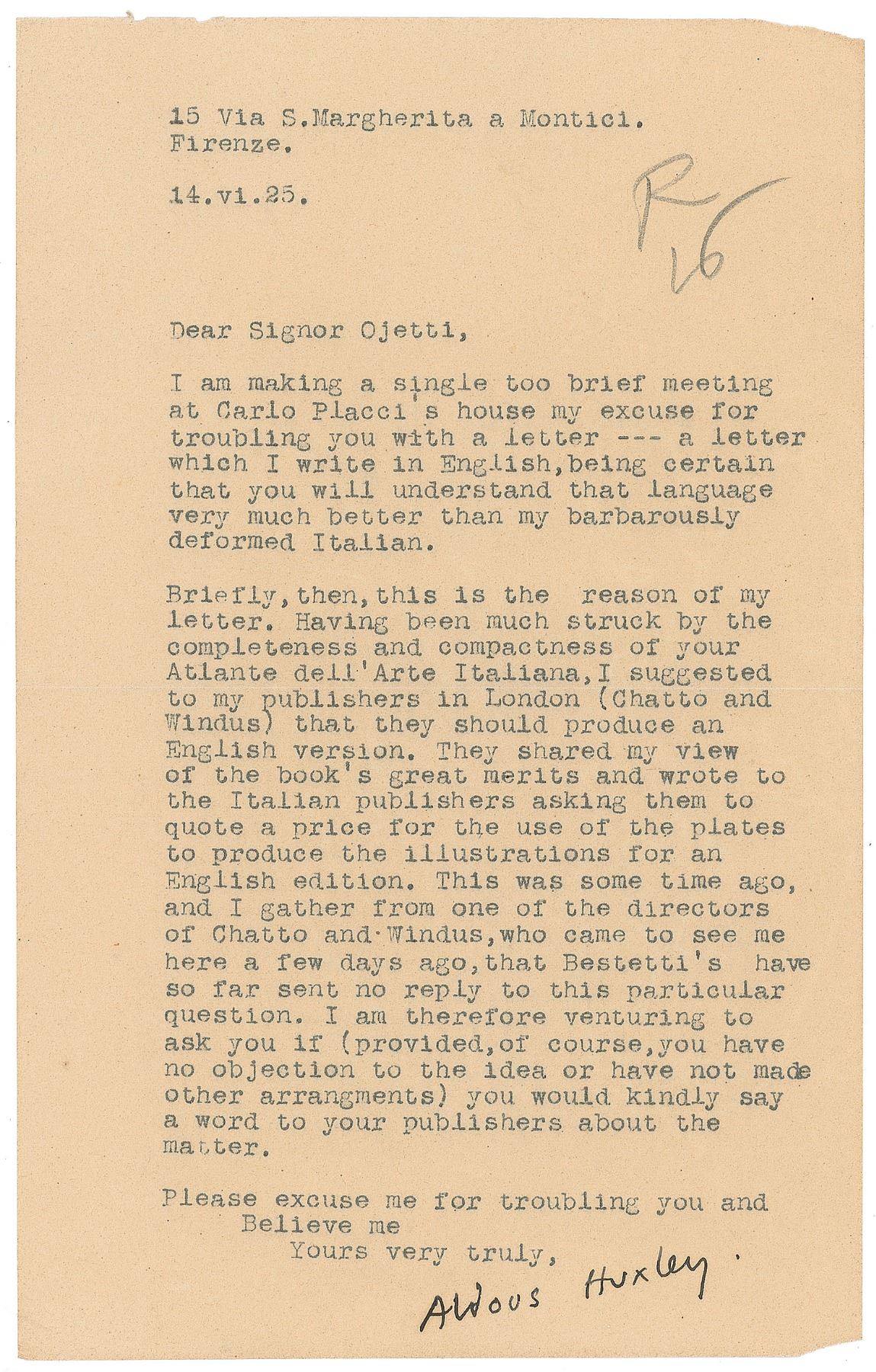 Two letters by Huxley to the Italian writer and journalist Ugo Ojetti: a TLS, one page, June 14, 1925, in part: "Briefly, then, this is the reason of my letter. Having been much struck by the completeness, and compactness of your Atlante dell’Arte Italiana, I suggested to my publishers in London (Chatto and Windus) that they should produce an English version. They shared my view of the book’s great merits and wrote to the Italian publishers asking them to quote a price for the use of the plates to produce the illustrations for an English edition"; and an ALS, one page both sides, June 17, 1925, in part: "Many thanks for your letter, the substance of which I will forward to my publishers. Their proposal would be, of course, to preserve your arrangement of the book with a faithful translation of the Italian text. At the same time they wish to use the existing plates for the illustrations, since the remaking of such plates from the original photographs would lead to the English edition being priced too high to be successful." In overall fine condition.