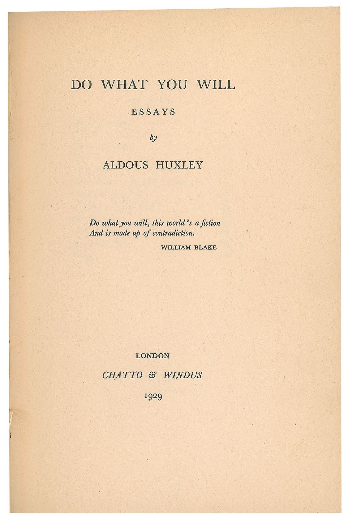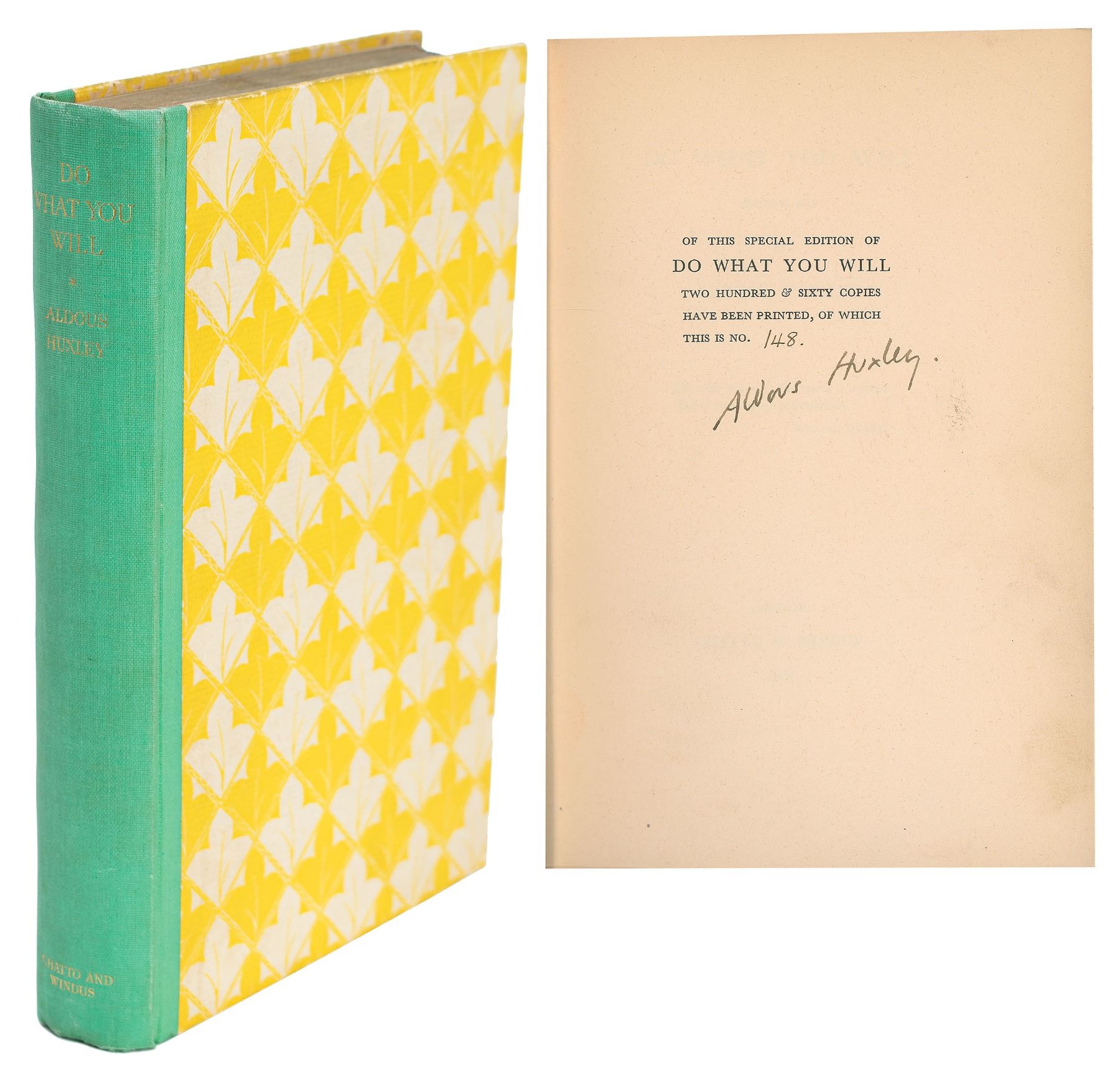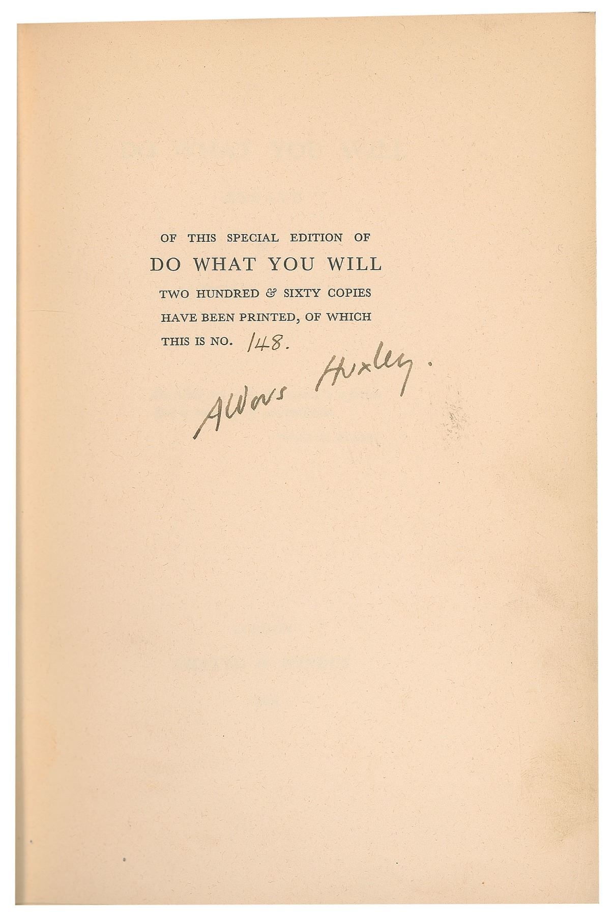 Signed book: Do What You Will. First edition, limited issue, numbered 148/260. London: Chatto & Windus, 1929. Hardcover, 6 x 8.5, 310 pages. Signed on the colophon in fountain pen, "Aldous Huxley." Autographic condition: fine. Book condition: VG/None.