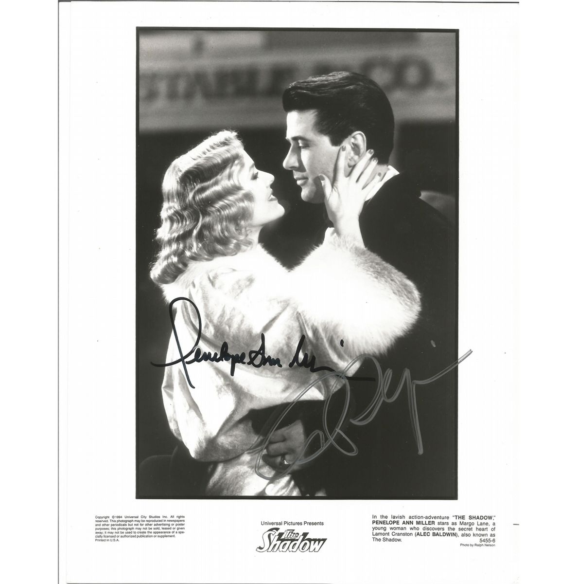 Original glossy b/w 8x10 signed by stars Alec Baldwin as the Shadow and co-star Penelope Ann Miller
