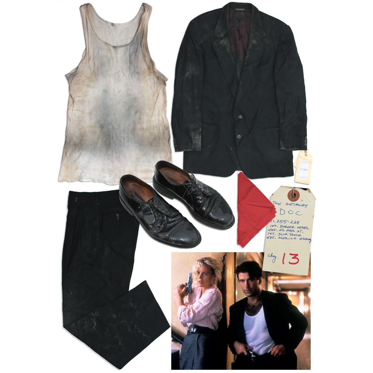 Alec Baldwin screen-worn hero costume from the 1994 crime thriller, ''The Getaway''. Baldwin played Carter ''Doc'' McCoy opposite Kim Basinger. Worn in various scenes toward the end of the film, costume includes a black suit, with a blazer measuring 20'' x 36'' and a pair of matching slacks measuring 34'' x 33''. Also includes a pair of Kenneth Cole dress shoes, size 12. Shoes have scuffing from wear and suit is stained with a chalky substance in various spots, though can be dry-cleaned. With two original wardrobe tags. Overall good to very good.