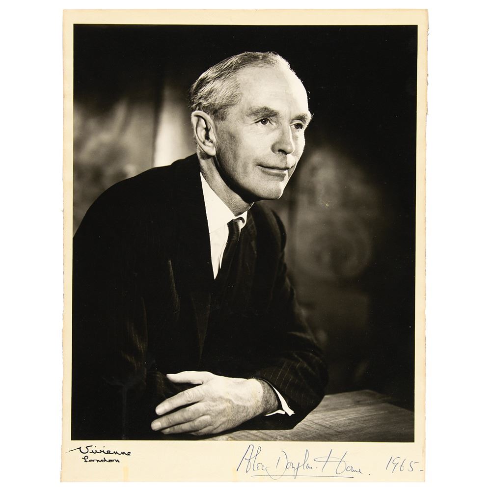Prime Minister of the United Kingdom (1903–1995) who served from 1963 to 1964. He was the only British prime minister born during the Edwardian era, and the last to hold office while a member of the House of Lords, before disclaiming his peerage and taking up a seat in the House of Commons for the remainder of his premiership. Uncommon vintage matte-finish photo of the former British prime minister by Vivienne of London, affixed to the original 10.25 x 13.5 mount, which is signed in ballpoint, "Alec Douglas-Home, 1965." In very good to fine condition, with several stains to the image.