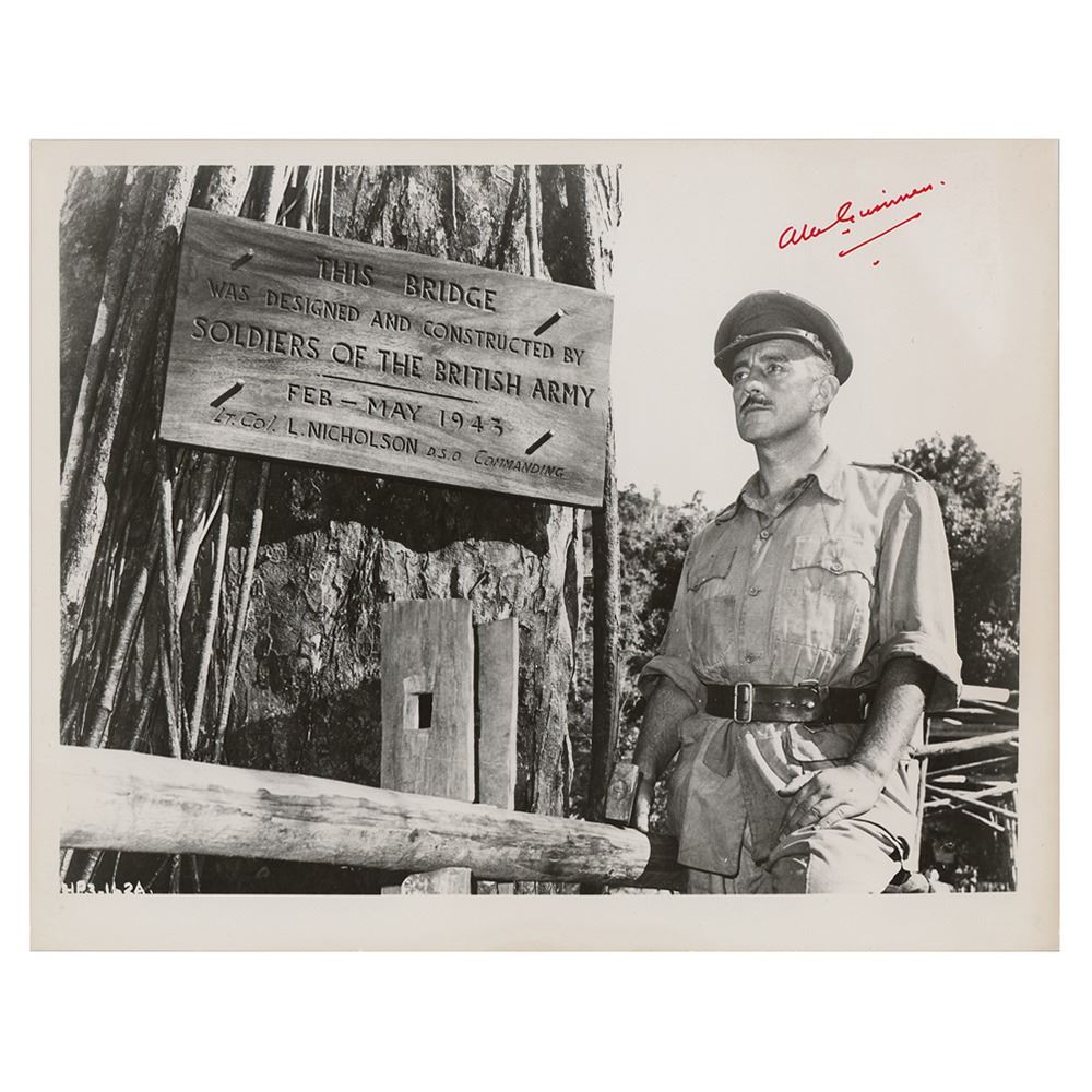 Glossy 10 x 8 photo of Alec Guinness as Lieutenant Colonel Nicholson from the 1957 war film The Bridge on the River Kwai, signed in red ink. In fine condition, with scattered light creasing.