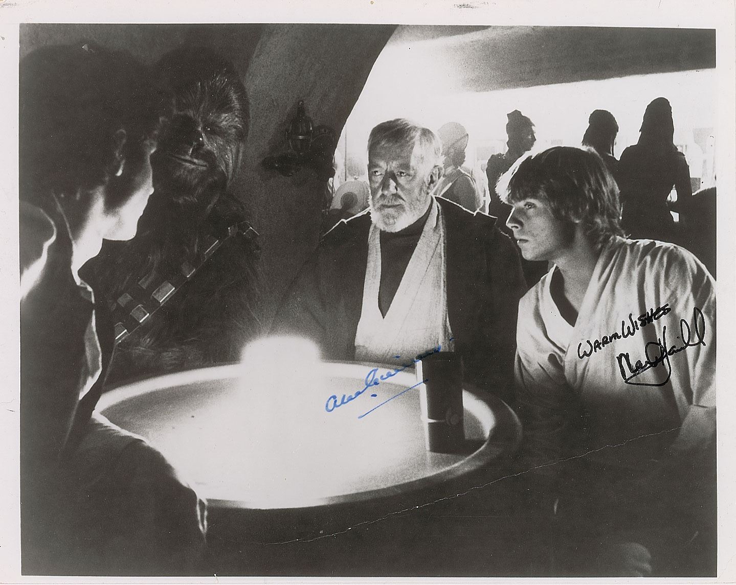 Glossy 10 x 8 photo of Han Solo and Chewbacca conversing with Obi-Wan Kenobi and Luke Skywalker during a scene in the 1977 film Star Wars, signed in blue ink, "Alec Guinness," and in black felt tip, "Warm wishes, Mark Hamill." In very good condition, with a long diagonal crease to the lower right. Photos signed by both Hamill and Guinness are uncommon and highly sought-after.