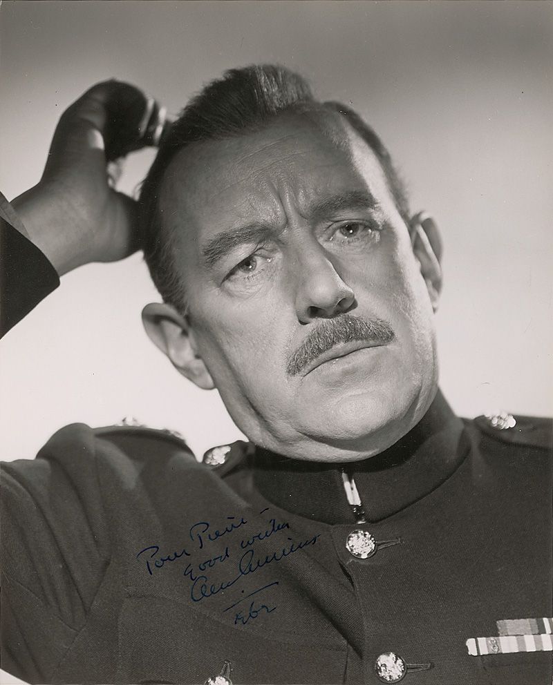 Vintage glossy 8 x 10 photo of Guinness as Maj. Jock Sinclair in Tunes of Glory, signed and inscribed in-person in fountain pen “Pour Pierre—good wishes, Alec Guinness, 1962.” In fine condition, with light surface creases and spotting.