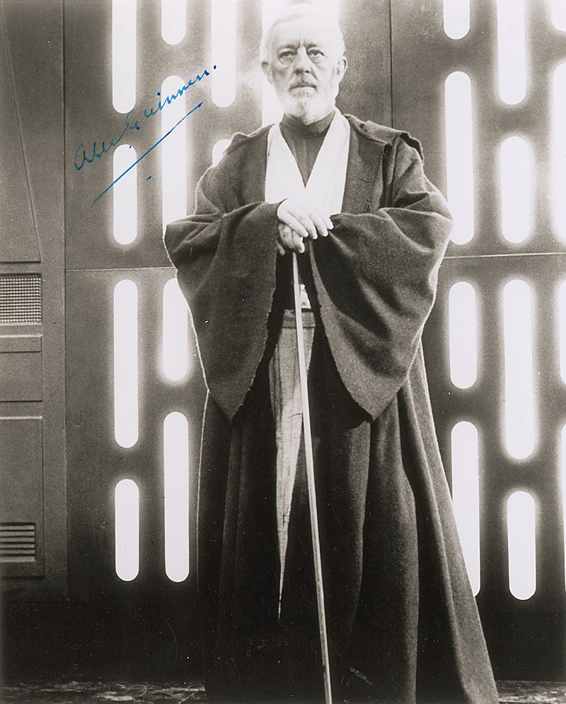 Glossy 8 x 10 photo of Guinness as Obi-Wan Kenobi, signed in blue ink. In fine condition. Guinness grew so tired of modern audiences seeming to remember him only for his role of Obi-Wan Kenobi that he would throw away the fan mail he received from Star Wars fans without reading it.