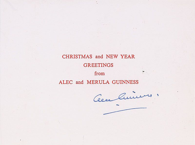 Privately produced Christmas card featuring a printed sentiment inside, 6.75 x 5, signed in blue ink by Guinness. In fine condition. Originally sent to his housekeeper, Mabel Cherry.