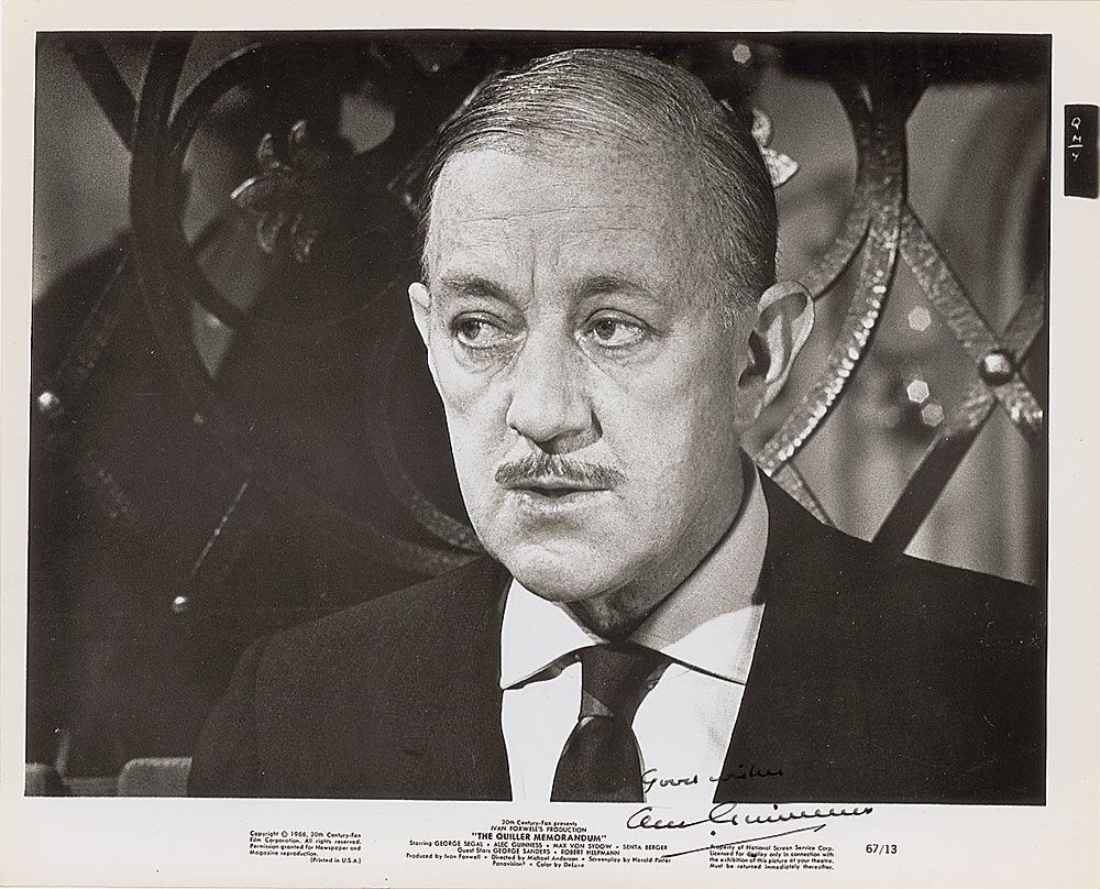 Glossy 10 x 8 photo of Guinness in The Quiller Memorandum, signed in black ink, “Good wishes, Alec Guinness.” In fine condition, with a couple trivial surface creases.