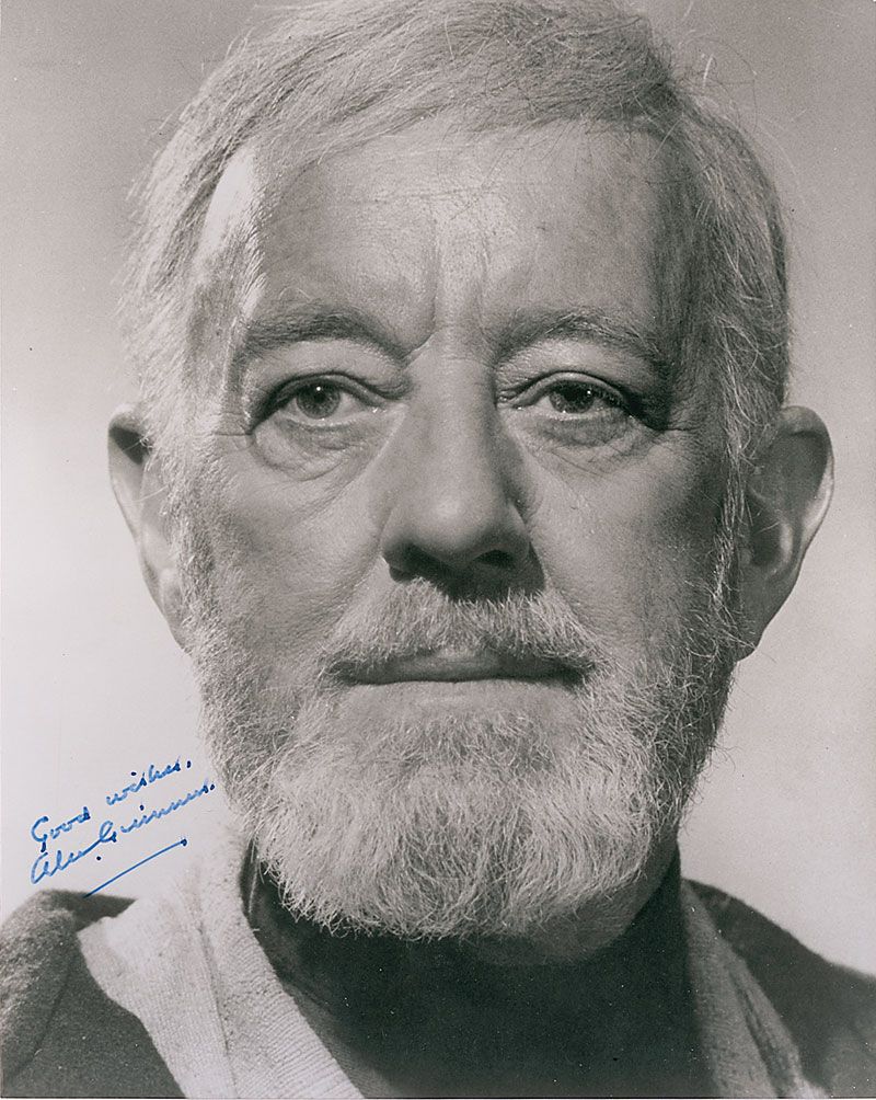 Glossy 8 x 9.75 photo of Guinness as Obi-Wan Kenobi, signed in blue ink, “Good wishes, Alec Guinness.” In fine condition. Guinness grew so tired of modern audiences seeming to remember him only for his role of Obi-Wan Kenobi that he would throw away the fan mail he received from Star Wars fans without reading it.