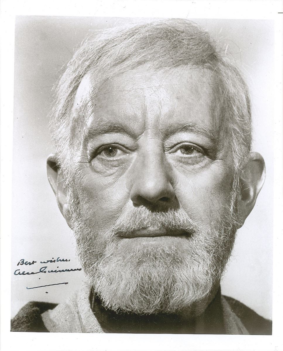 Glossy 8 x 9.75 close-up photo of Guinness as Obi-Wan Kenobi, signed in black ink, "Best wishes, Alec Guinness." In fine condition.