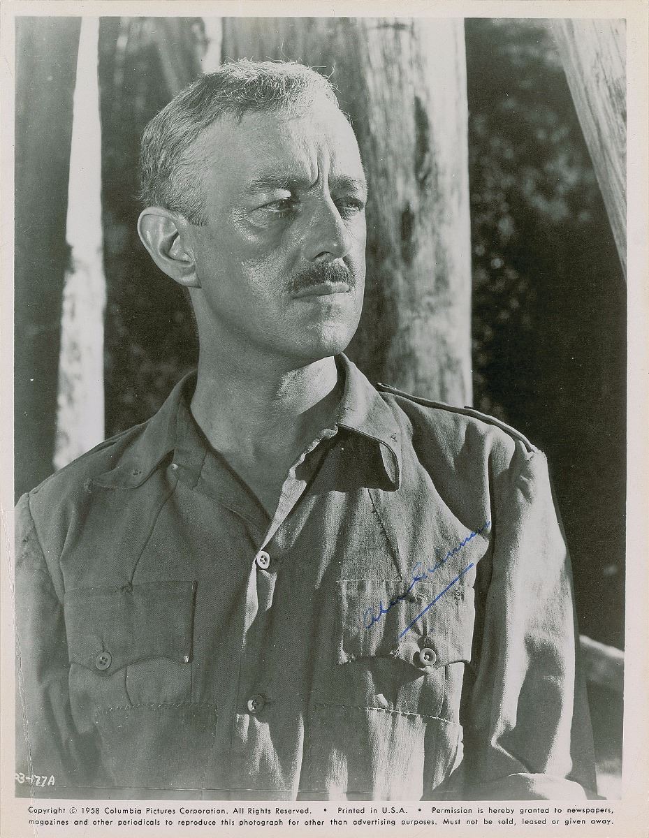 Vintage glossy 8 x 10 photo of Guinness as Lieutenant Colonel Nicholson in the 1957 classic The Bridge on the River Kwai, signed in fountain pen. In very good to fine condition, with scattered light creasing (heavier to lower left).