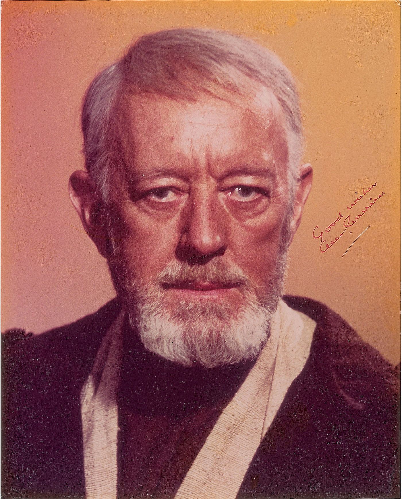 Color glossy 8 x 10 photo of Guinness as Obi-Wan Kenobi in Star Wars, signed in ink, "Good wishes, Alec Guinness." In fine condition. From the Harvey and Rhoda Kuflik Collection.