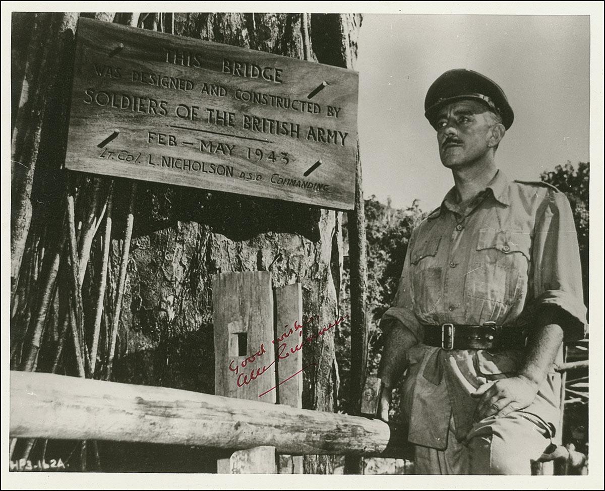 Matte-finish 10 x 8 photo from Bridge on the River Kwai, signed in red felt tip, “Good wishes, Alec Guinness.” In fine condition, with mild rippling along the left side, not impacting the signature. Pre-certified PSA/DNA and RRAuction COA.