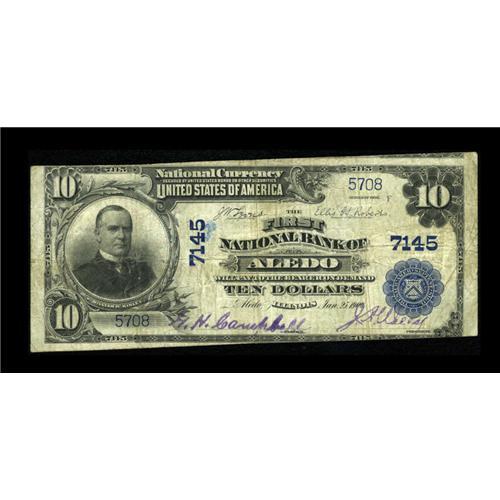 <B>Aledo, IL</B></I> - $10 1902 Plain Back Fr. 624 <B>The First NB</B></I> Ch. # 7145<BR>Bold signatures highlight this note which comes from the more common issuer of two in town for large size examples. The cut is a touch askew with an errant blue mark near the left side charter number. <B>Fine.</B></I><BR><I>From The Lincoln Collection</B></I><BR><BR><b>Shipping:</b> Coins & Currency (<a target="_blank" href="http://www.heritageauctions.com/common/shipping.php">view shipping information</a>)