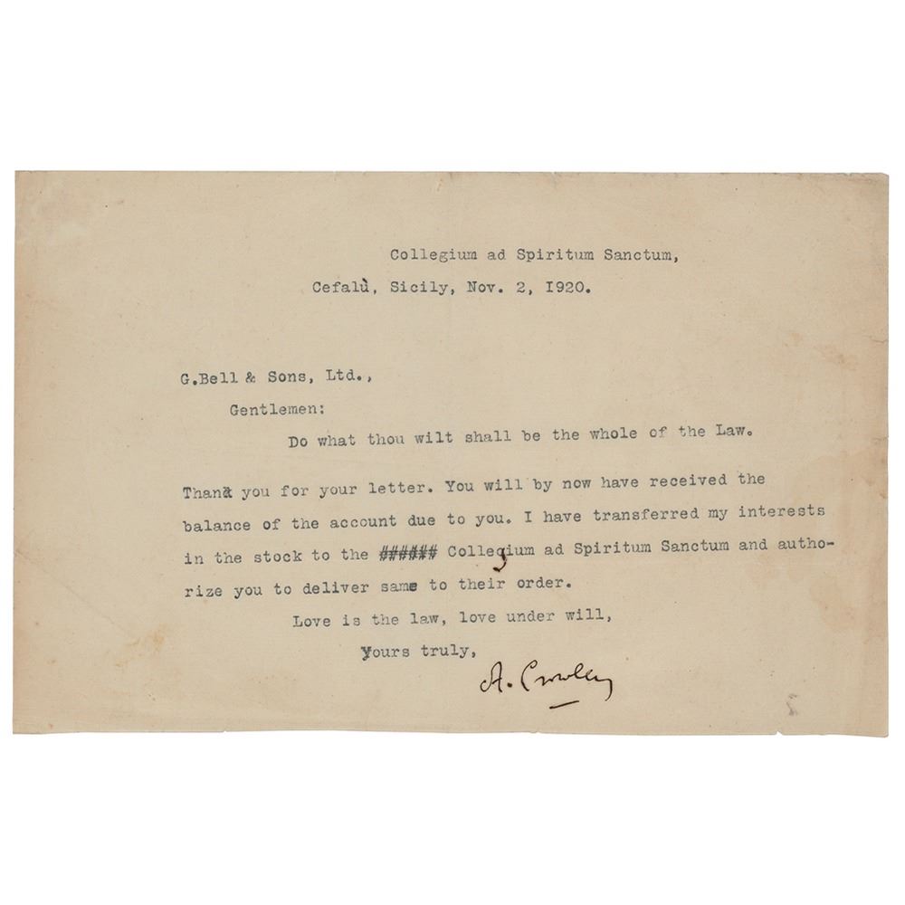 TLS signed “A. Crowley,†one page, 9 x 5.75, November 2, 1920. Written from the Collegium ad Spiritum Sanctum in Cefalu, Sicily, a letter to the publishing house George Bell & Sons, in full: "Do what thou wilt shall be the whole of the Law. Thank you for your letter. You will by now have received the balance of the account due to you. I have transferred my interests in the stock to the Collegium ad Spiritum Sanctum and authorize you to deliver same to their order. Love is the law, love under will." In very good to fine condition, with scattered light staining and creasing.