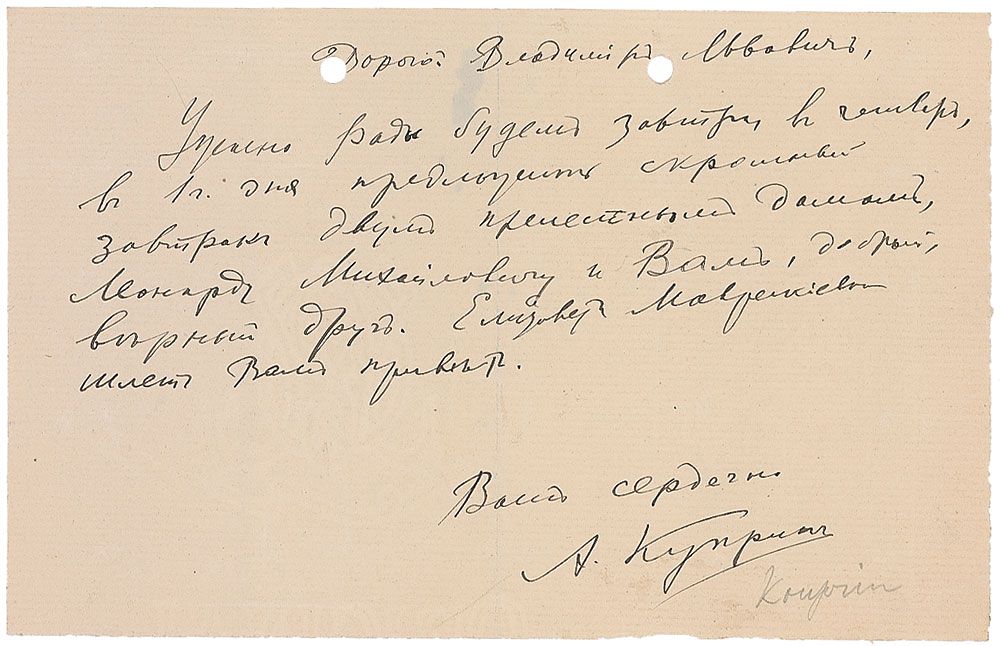 Russian writer, explorer, and adventurer (1870–1938) best known for his story The Duel. ALS in Russian, signed “A. Kuprin,” one page, 8.25 x 5.25, no date. Untranslated letter to fellow writer Vladimir Bienstock in Paris. In fine condition, with a central vertical fold, two punch holes near top edge, and pencil notation under signature.