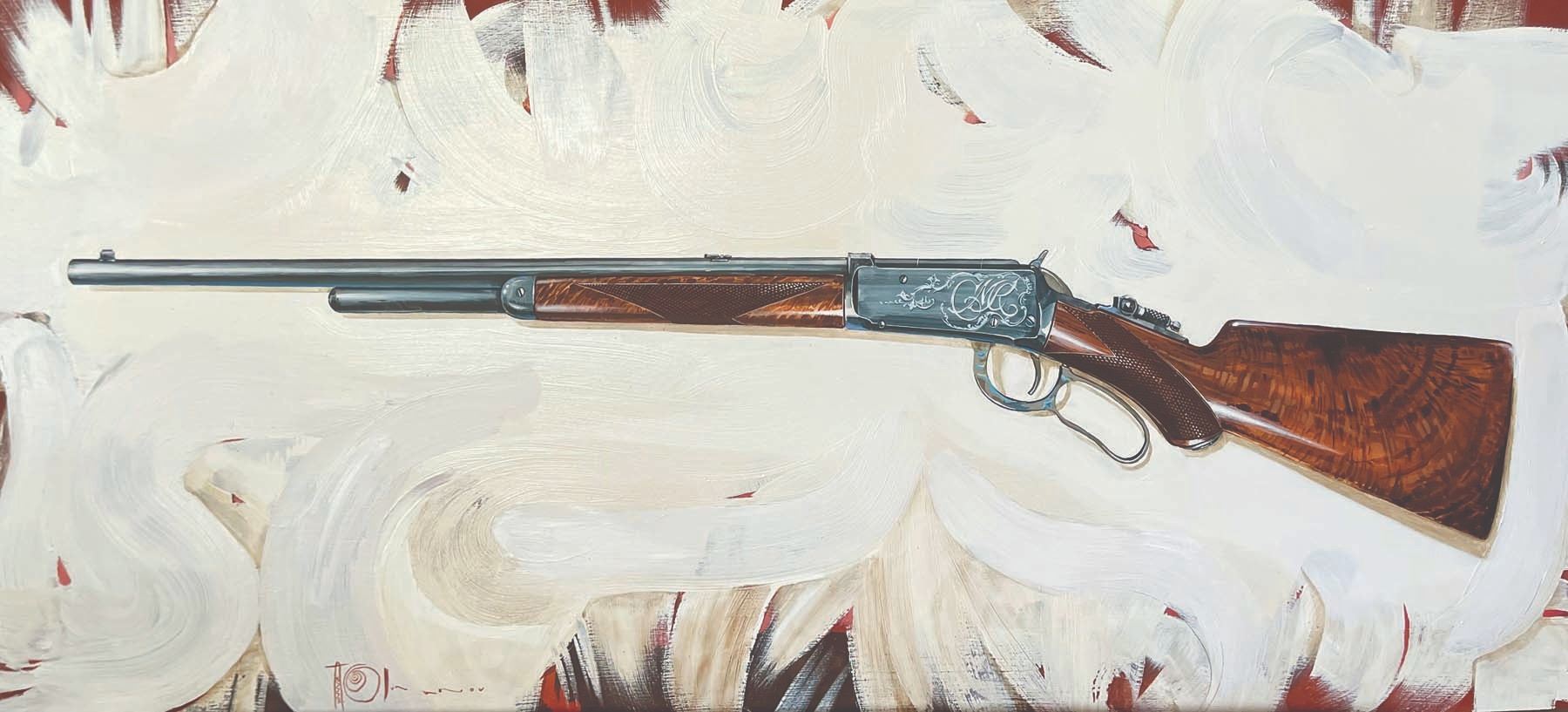 The cover of this year’s auction catalogue shows Charlie Russell in about 1920 working to put the finishing touches on Salute to the Robe Trade in his log cabin studio in Great Falls. Just behind that masterpiece is the gun rack for many of his rifles. The one in this painting is missing from the rack and has an intriguing story associated with it. For the rest of the story, go to https://cmrussell.org/2022-August-Catalog/