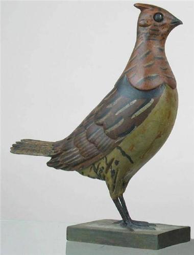 Alert miniature ruffed grouse possibly by Forslund. In XOP with a turned head and nicely carved feather detail. Line age check visible under the paint on the back. (decoy)