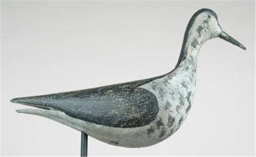 Alert yellowlegs with split tail and nail head eyes by the Thomas family, Hingham, MA. In XOP with light wear. Made in two pieces with the neck seam visible. The Thomas brothers were heavily influenced by Joseph Lincoln and made decoys similar to some of the styles made by Lincoln. (decoy)