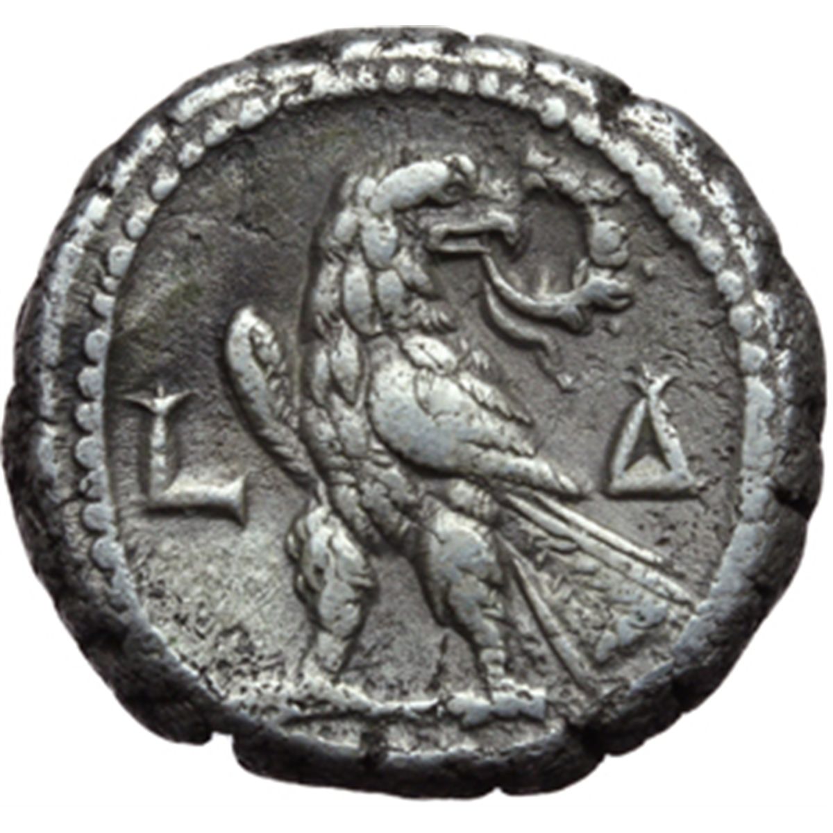Impero Romano. Alessandro Severo (222-235). Billon-tetradracma, Alexandria. D/ A KAI MAAVP[ ]AΛEΞANΔPOC. Busto laureato, drappeggiato e corazzato a destra. R/ Aquila, stante a sinistra con la testa a destra, tiene una corona nel becco. Nel campo, L-Δ. Cfr. BMC 1694. AG. g. 14.00 mm. 23.00 In lega ad alto tenore d'argento. Bel BB/BB+.