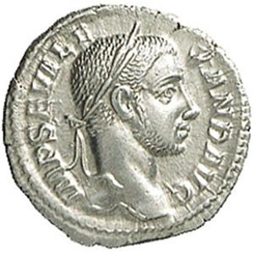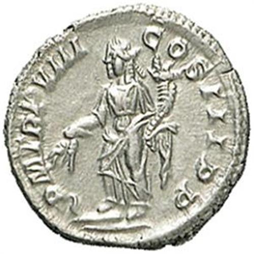 Alessandro Severo (222-235). Denario. D/ Testa laureata a destra. R/ PM TR P VIII COS III PP. L'Annona, stante tre quarti a sinistra, con un piede su prua, tiene due spighe di grano e cornucopia. RIC 94. gr. 3.14 AG. qFDC.