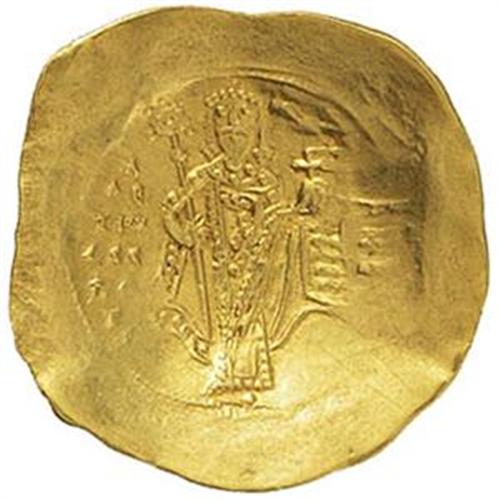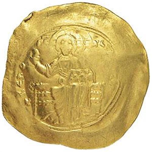 Monete Bizantine. Alessio I (1081-1118). AU hyperpyron, Costantinopoli. D/ Cristo benedicente seduto in trono di fronte. R/ Alessio, stante di fronte, indossa corona e clamide e tiene labaro e globo crucigero. In alto a destra, la manus Dei. R. 2057-8. gr. 4.19 R. AU. BB/qSPL.