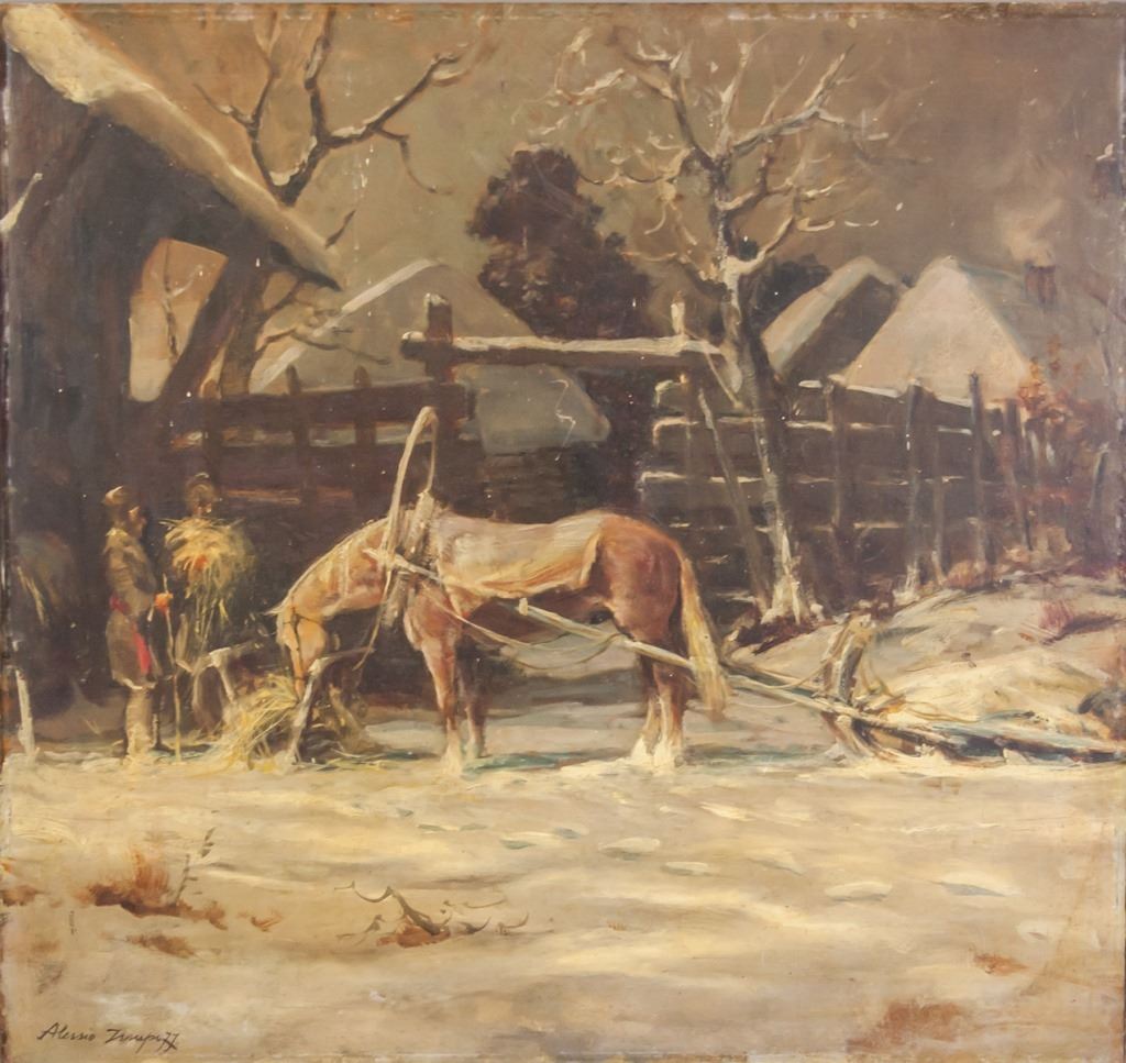 Oil on board. Featuring a horse with a yoke, eating hay. Two figures stand by the horse head watching it eat. Signed by Alessio Issupoff (1889-1957, Italian) to the bottom left corner. 50 x 53 cm (19.7 x 21 inches). Provenance: Private American estate, Southampton, New York, 1982. Thence by descent.