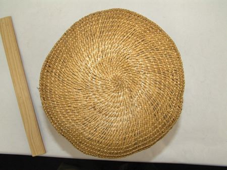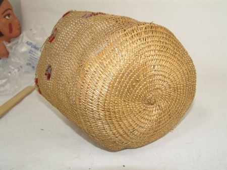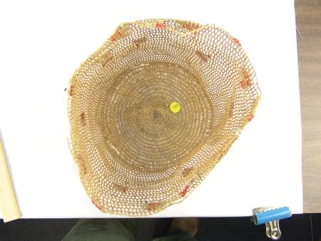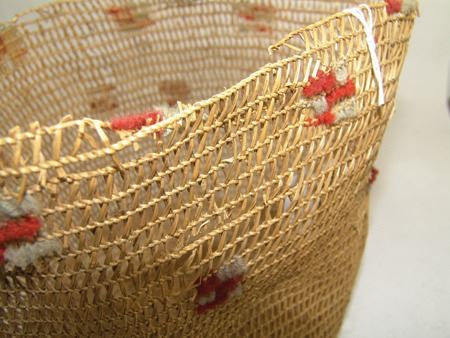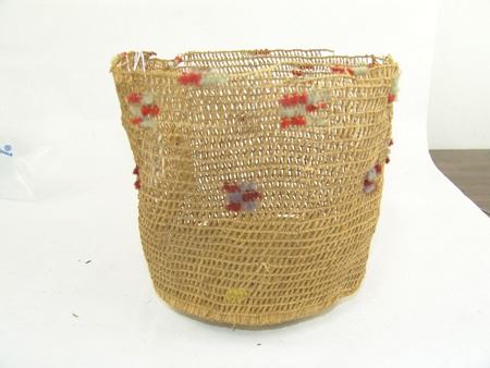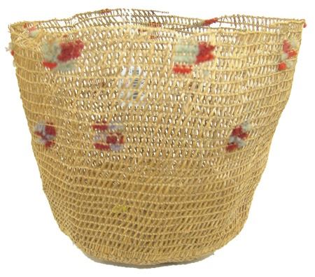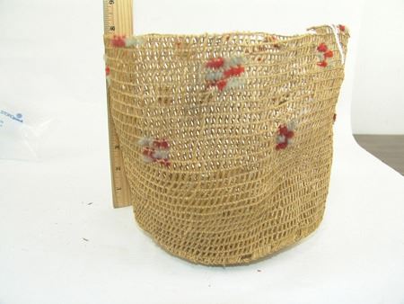Delicate twined open weave basket with tufts of gray and red woolens. Fair condition, complete but with broken stitches in places. 9" x 7-1/2"