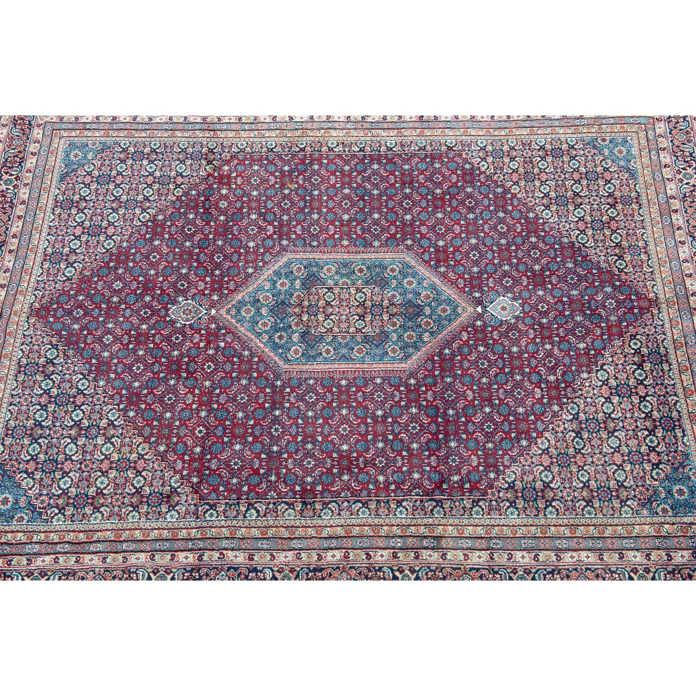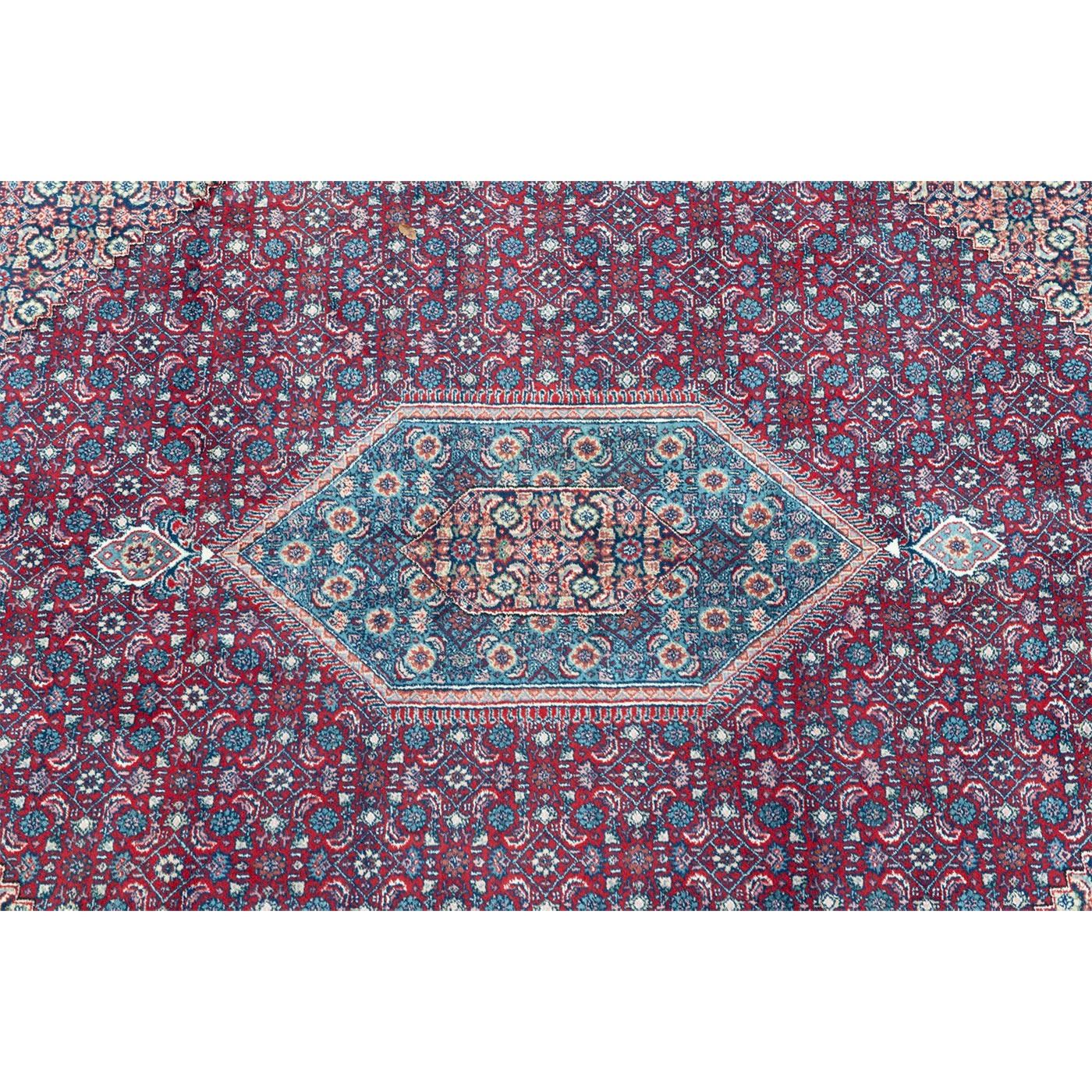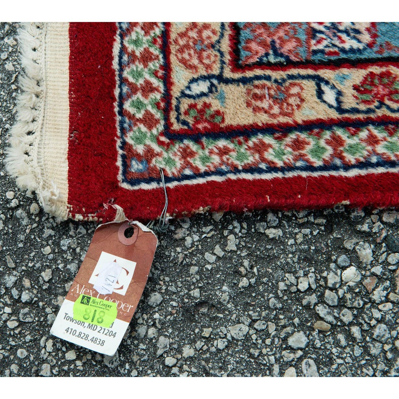 Vintage hand knotted Persian low pile rug in red and light blue intricate floral patterns with multiple borders. Throughout entire rug are hexagon shape designs with symmetric layouts. White fringe on both sides. Alex Cooper tag attached. 9ft x 12ft. #alexcooper #persian #arearug #vintage