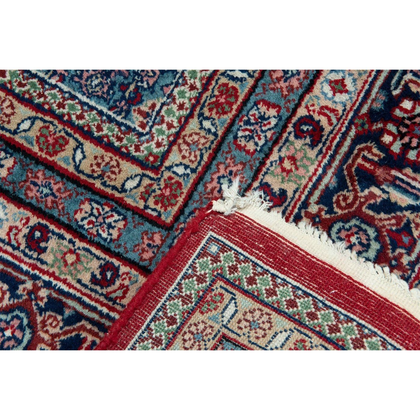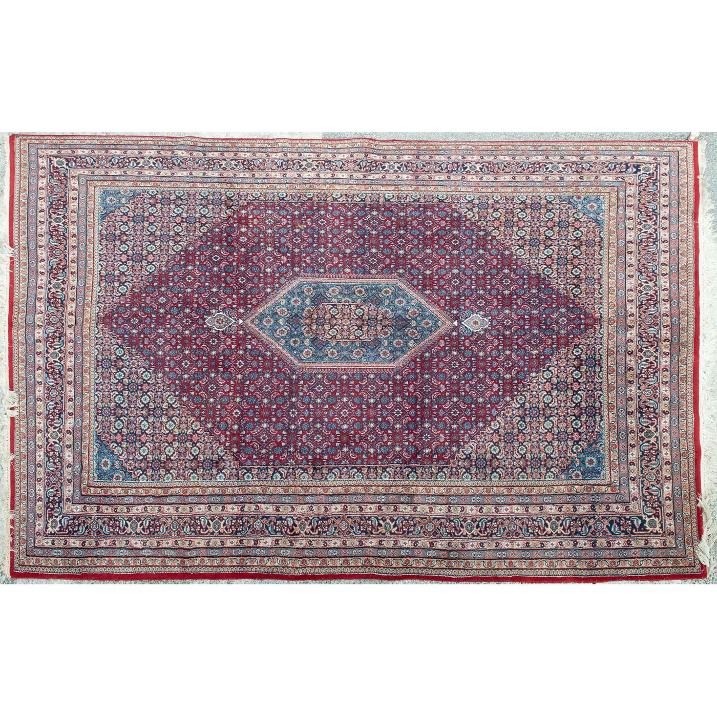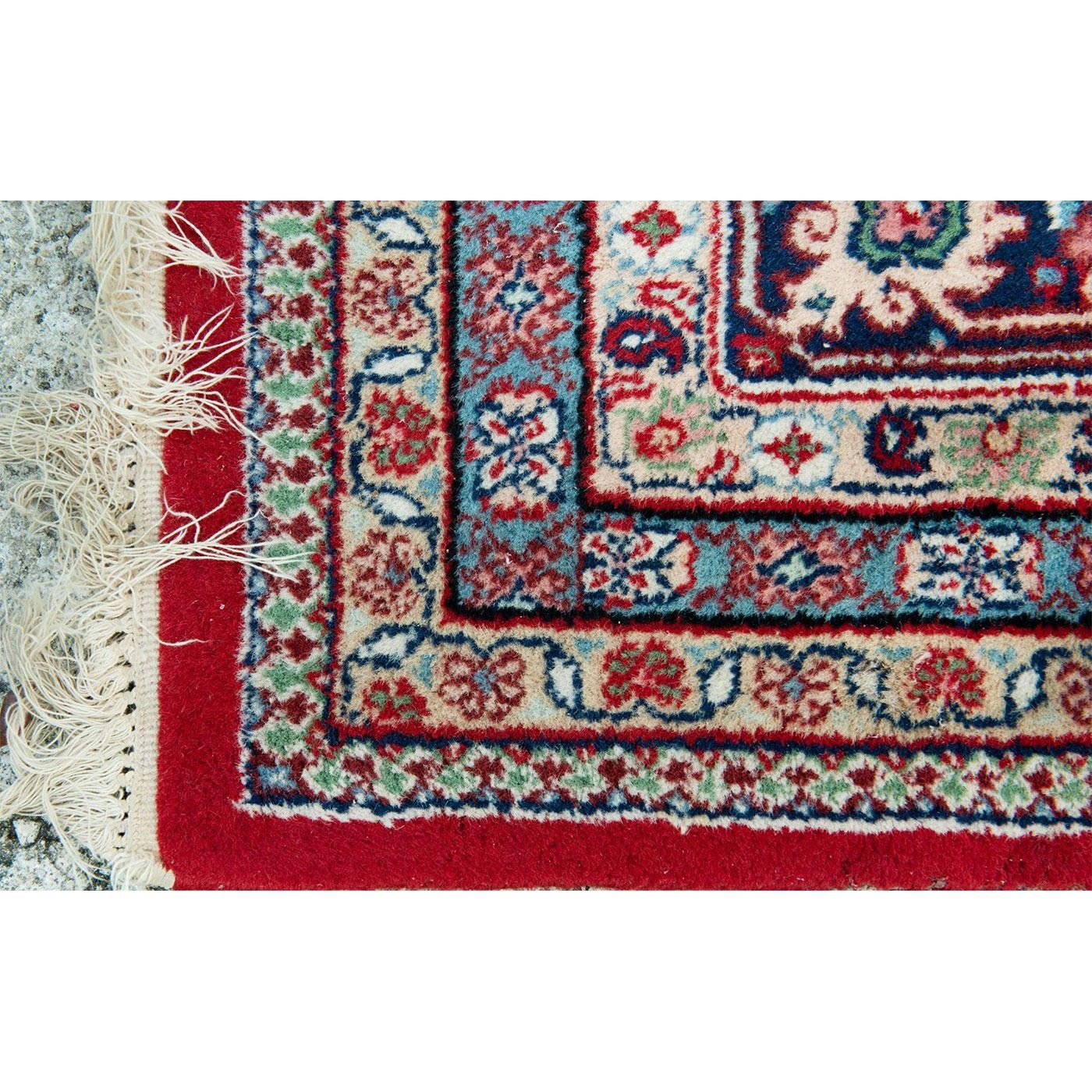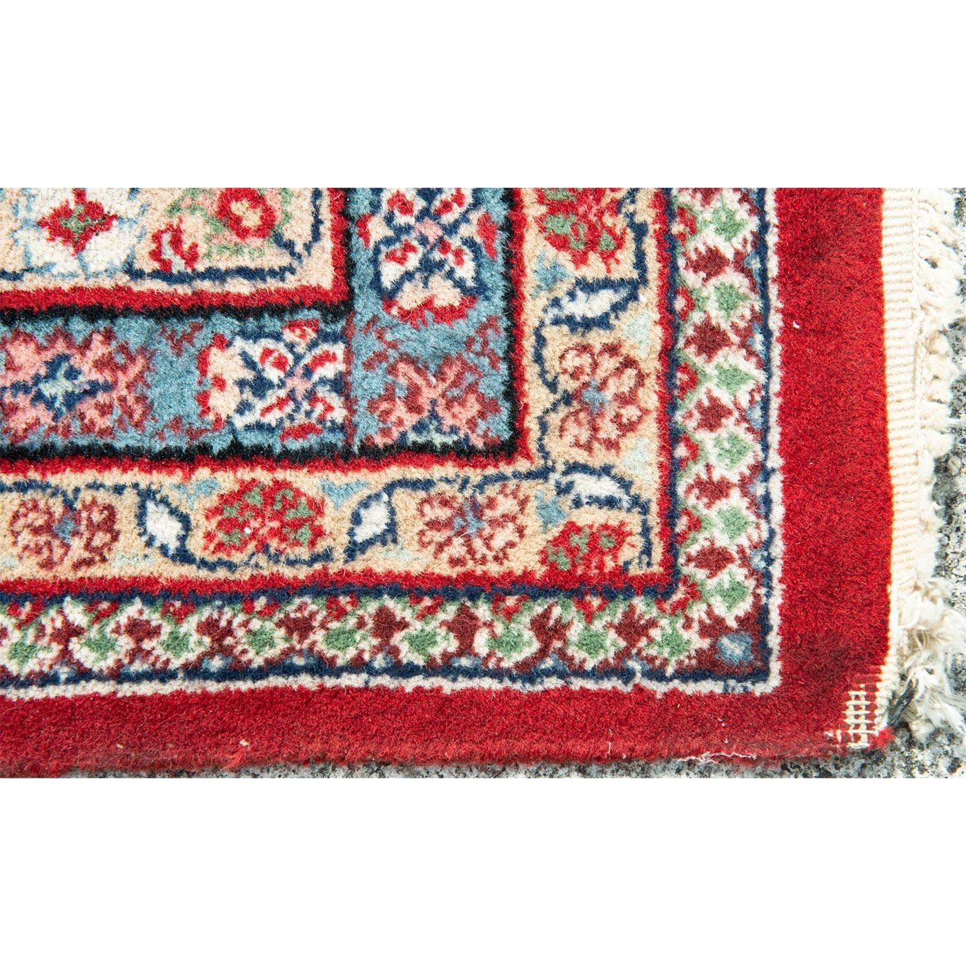 Vintage hand knotted Persian low pile rug in red and light blue intricate floral patterns with multiple borders. Throughout entire rug are hexagon shape designs with symmetric layouts. White fringe on both sides. Alex Cooper tag attached. 9ft x 12ft. #alexcooper #persian #arearug #vintage