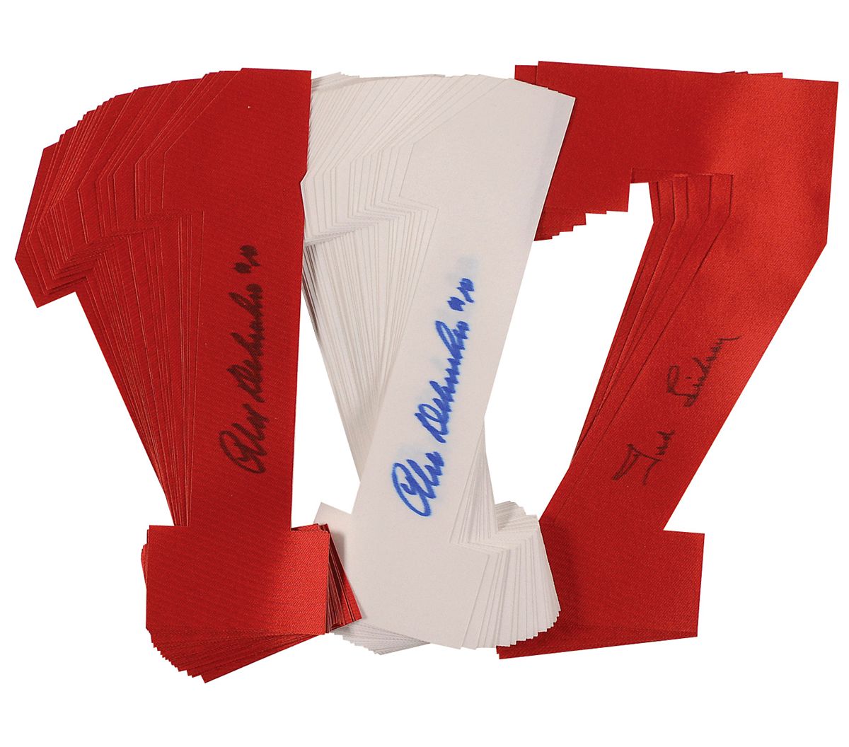 Sixty-five uniform numbers: 59 ‘1s,’ 34 white and 25 red, each signed in blue felt tip by Alex Delvecchio; and six ‘7s,’ each signed in felt tip by Ted Lindsay. In fine condition, with expected light feathering to signatures.