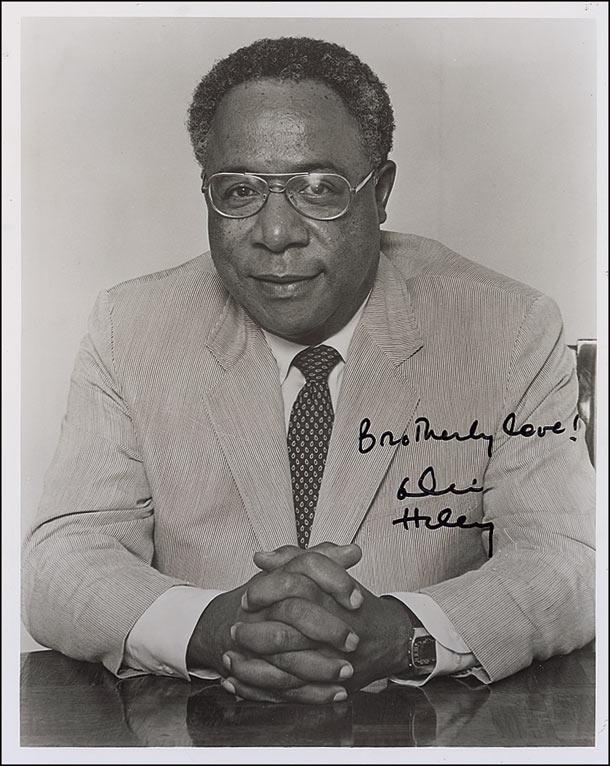 Glossy 8 x 10 photo, signed in black felt tip, “Brotherly love! Alex Haley.” In fine condition, with trivial soiling to one corner.