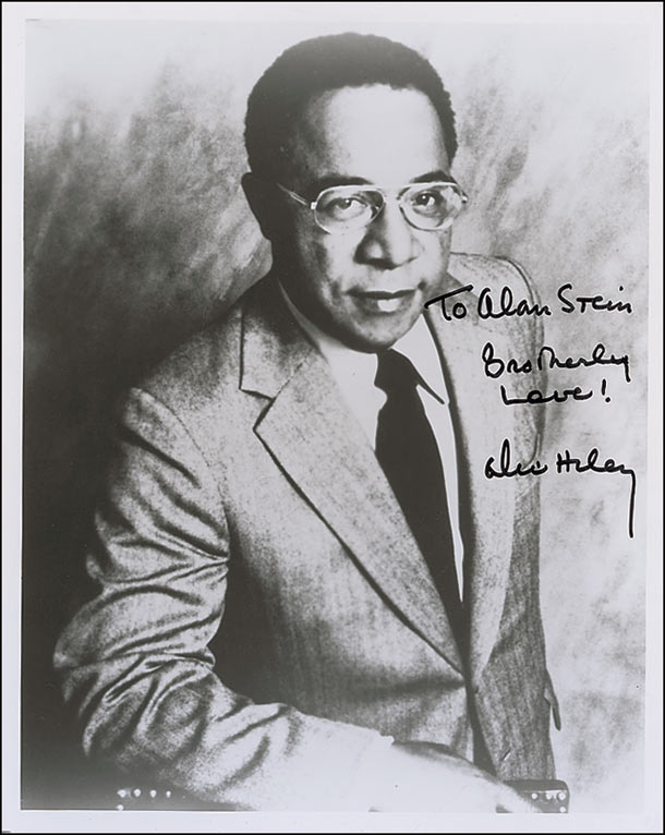 Glossy 8 x 10 photo, signed and inscribed in black felt tip “To Alan Stein, Brotherly love, Alex Haley.” In fine condition.