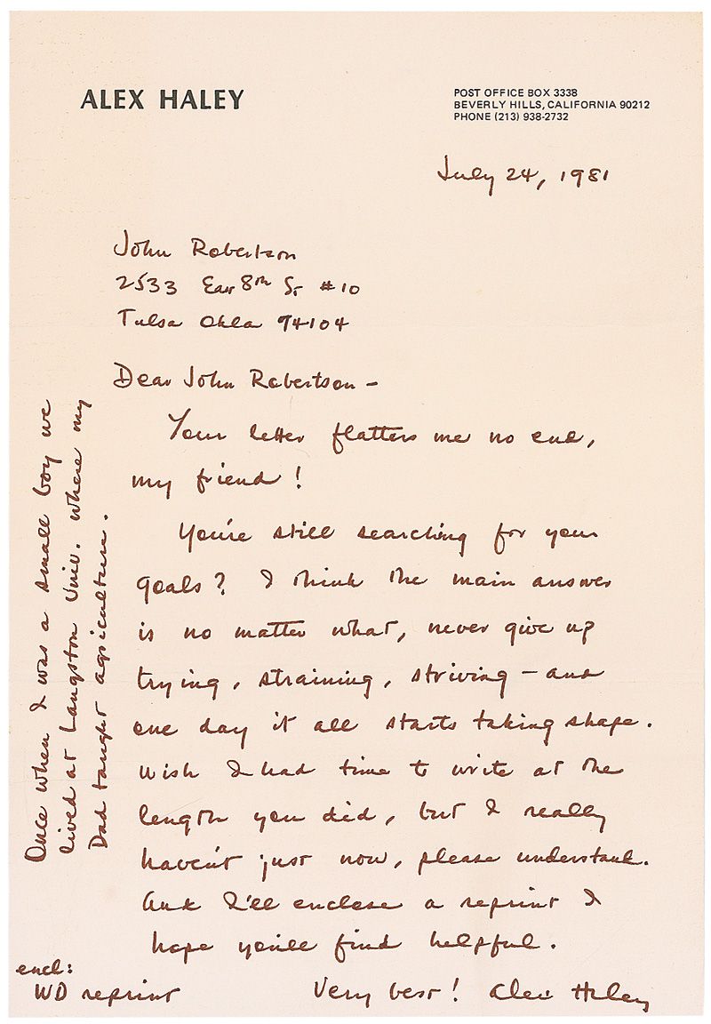 ALS, one page, 7.25 x 10.5, personal letterhead, July 24, 1981. In part: “You’re still searching for your goals? I think the main answer is no matter what, never give up trying, straining, striving—and one day it all starts taking shape. Wish I had time to write at the length you did, but I really haven’t just now, please understand. But I’ll enclose a reprint I hope you’ll find helpful.” In fine condition, with a couple horizontal folds and creases. Accompanied by the original mailing envelope and the article Haley refers to in the letter.