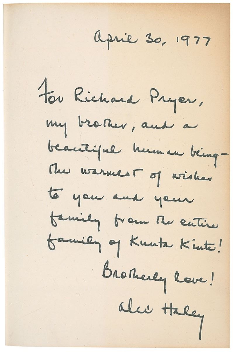 Signed book: Roots. Later printing. Garden City, NY: Doubleday, 1976. Hardcover with dust jacket, 5.75 x 8.5, 688 pages. Signed and inscribed on the first free end page in black felt tip, “For Richard Pryor, my brother, and a beautiful human being—the warmest of wishes to you and your family from the entire family of Kunta Kinte! Brotherly love! Alex Haley.” Autographic condition: fine. Book condition: VG/VG-. Accompanied by a full letter of authenticity from PSA/DNA. A significant association copy.