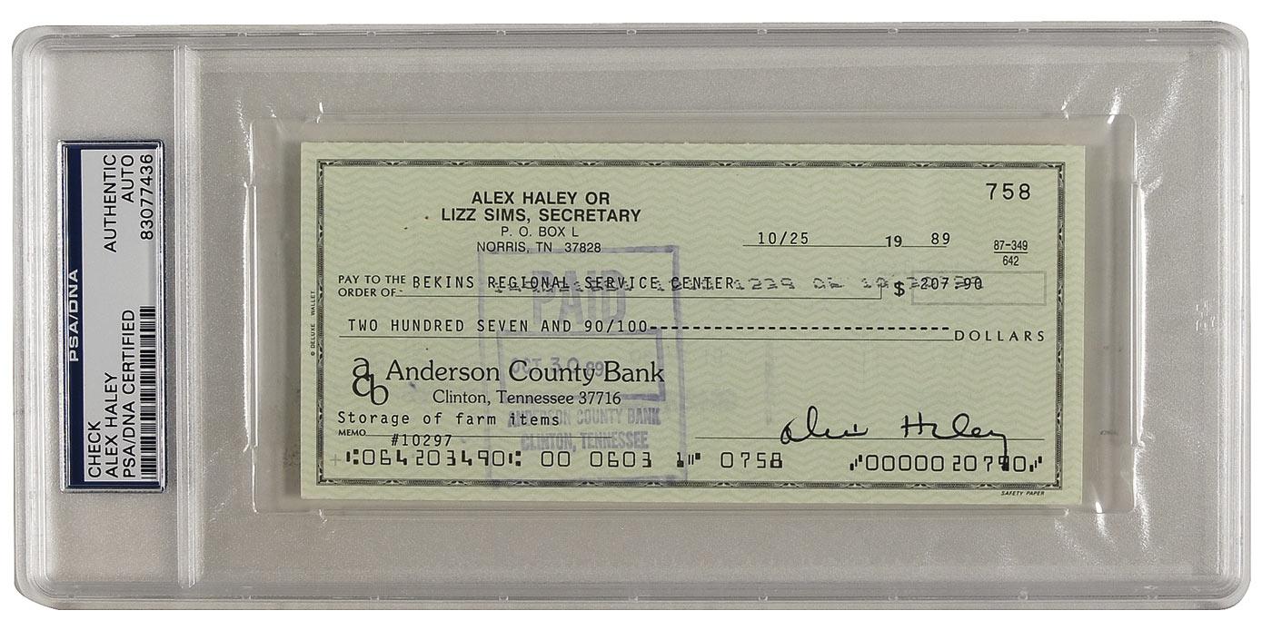 Personal check, 6 x 2.75, filled out in type and signed by Haley, payable to Bekins Regional Service Center for $207.90, October 25, 1989. Encapsulated in a plastic PSA/DNA authentication holder. In fine condition, with show-through from expected bank cancellation stamp on the reverse.