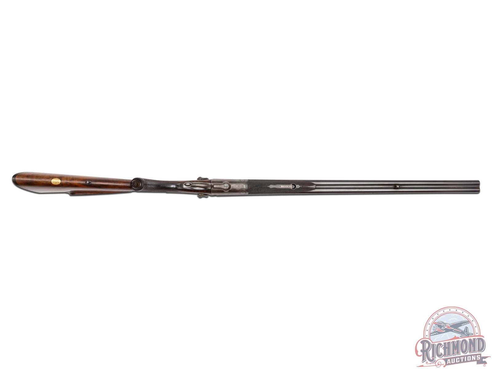 Beautifully made underlever side by side double rifle with exposed hammers made by Alex Henry of Edinburgh, Scotland for Dudley Persee, High Sheriff of Galway County, Ireland in 1876. Rifle has blued 26" steel side by side rifled barrels with matted rib, extractors, blade front sight, and two leaf rear sight in 450 Express caliber. Rib is marked "Alex Henry Edinburgh and London Patent No 3086 / Maker to Their Royal Highness The Prince of Wales and Duke of Edinburgh". Case-hardened round body action with floral vignette engraving, back action maker marked locks, double triggers and extended tang. Fine English walnut checkered pistol grip stock with cheekpiece, horn grip cap, gold vanity plate and Bakelite butt plate, matching checkered walnut splinter forearm with Anson & Deeley latch. Comes in oak feltlined case with twenty empty shells and Donald Dallas letter and genealogy of Persee Family. LOP: 13-7/8". DAC: 1-1/4". DAH: 1-1/2". CALIBER: 450 Express. S/N: 3452. FFL STATUS: Antique.