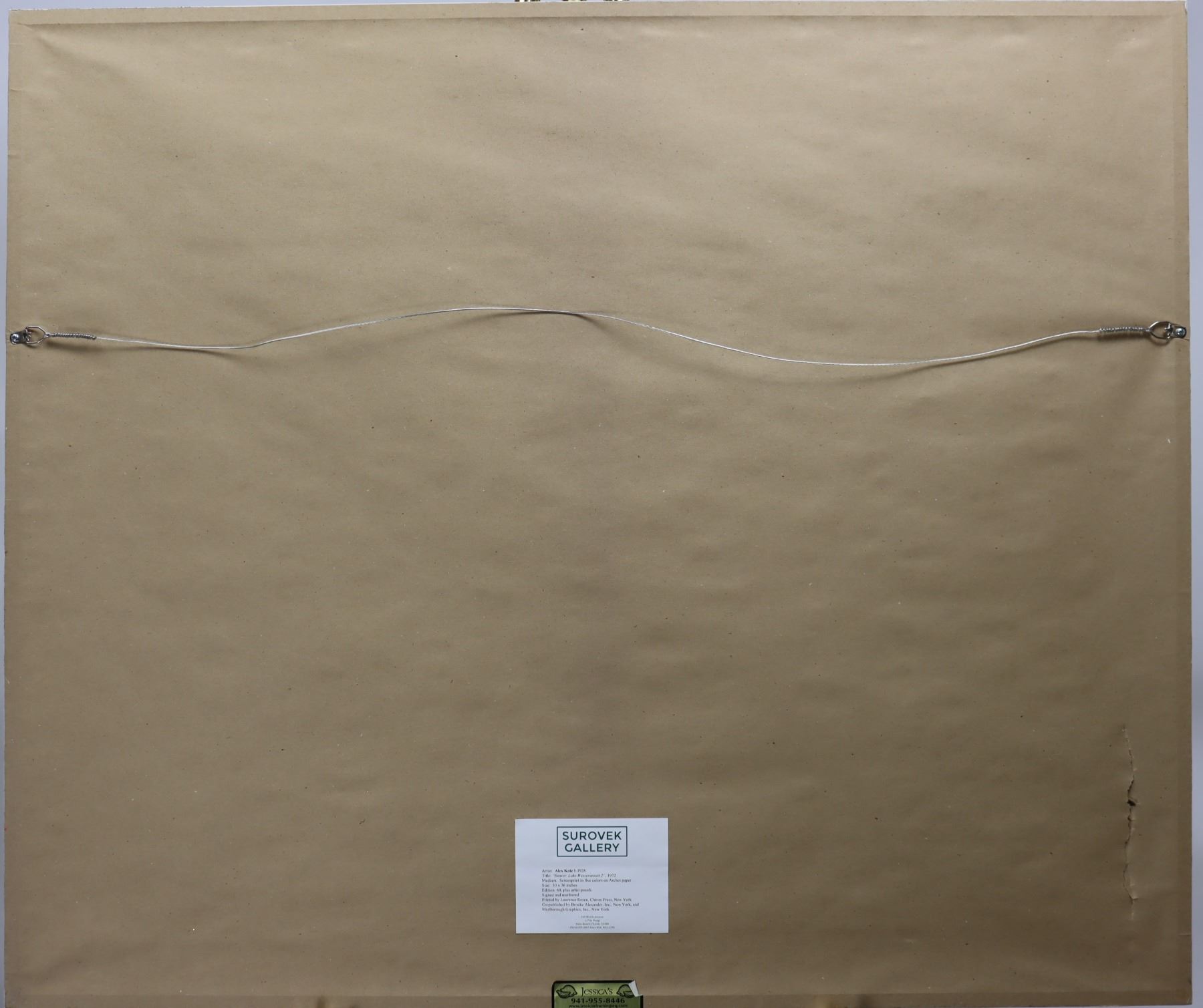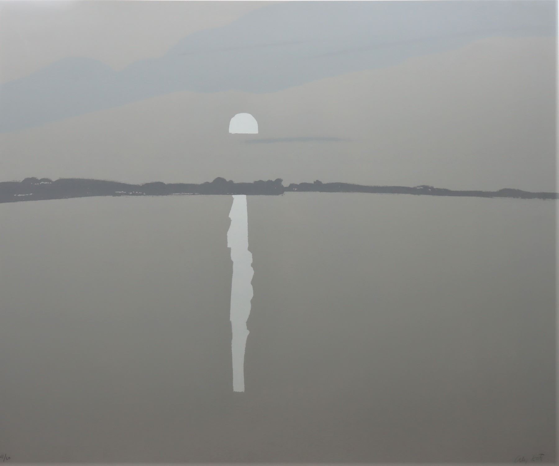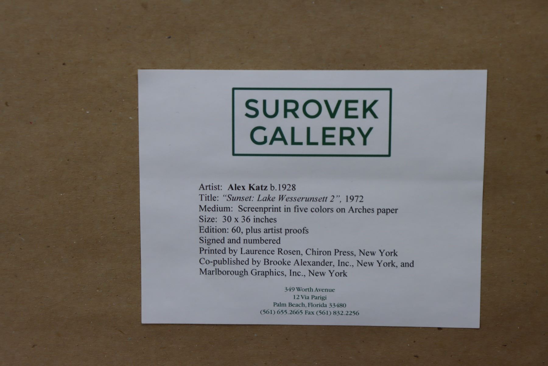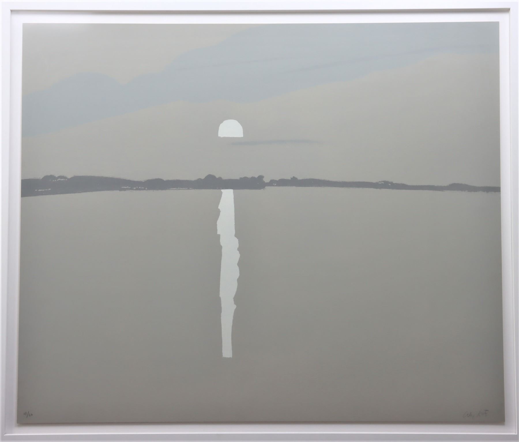 Screen print in in five colors on Arches paper, titled "Sunset: Lake Wesserunsett 2", 1972. Floating in the frame, number 41 out of an edition of 60, and signed in the lower right. Katz is an American figurative painter, known for his large-scale simplified images of family and friends. He created iconic paintings which documented the American scene and landscapes which offered monumental glimpses of the ordinary world. Gallery label on back. Printed by Laurence Rosen, Chiron Press, New York. Co-Published by Brooke Alexander, Inc., New York, and Marlborough Graphics, Inc., New York.