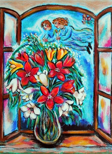 Artist: Alex Meilichson - Title: Angels Blossom - Medium: Serigraph on Fine Art Paper - Signature: Hand-signed by the Artist - Limited Edition: 450 - Image Size: 12 inches x 9 inches - Paper Size: Approximately 13.5 inches x 10.5 inches - Framed: Unframed - Details: This work comes with a Certificate of Authenticity - Alex Meilichson has developed a figurative style, using a palette of brilliant colors. His favorite media are ink, acrylic and oil on canvas. He paints Judaic themes, landscapes and still life in an expressionist 'Ecole de Paris' approach. -