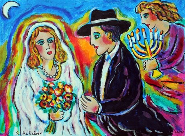 Artist: Alex Meilichson - Title: Moonlight Wedding - Medium: Serigraph on Fine Art Paper - Signature: Hand-signed by the Artist - Limited Edition: 450 - Image Size: 9 inches x 12 inches - Paper Size: Approximately 10.5 inches x 13.5 inches - Framed: Unframed - Details: This work comes with a Certificate of Authenticity - Alex Meilichson has developed a figurative style, using a palette of brilliant colors. His favorite media are ink, acrylic and oil on canvas. He paints Judaic themes, landscapes and still life in an expressionist 'Ecole de Paris' approach. -