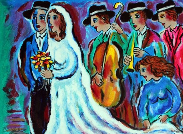 Artist: Alex Meilichson - Title: Wedding Vows - Medium: Serigraph on Fine Art Paper - Signature: Hand-signed by the Artist - Limited Edition: 450 - Image Size: 9 inches x 12 inches - Paper Size: Approximately 10.5 inches x 13.5 inches - Unframed - Details: This work comes with a Certificate of Authenticity - Alex Meilichson has developed a figurative style, using a palette of brilliant colors. His favorite media are ink, acrylic and oil on canvas. He paints Judaic themes, landscapes and still life in an expressionist 'Ecole de Paris' approach. -